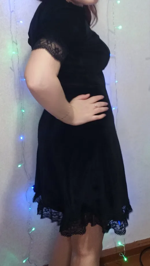 Платье очень милое, с очень приятным бархатным прикосновением. Ткань в порядке и не мешает швам. Мне 1'60, и у меня широкая спина, как бедра, и L подходит мне хорошо, как и длина. Я рекомендую это.