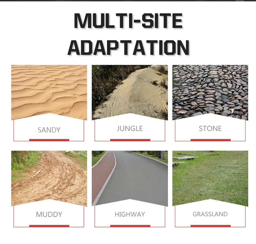 -Прочная резиновая шина. Подходит для всех местности, каменных свай, песка, цементных дорог, гладких полов, сопротивления трению