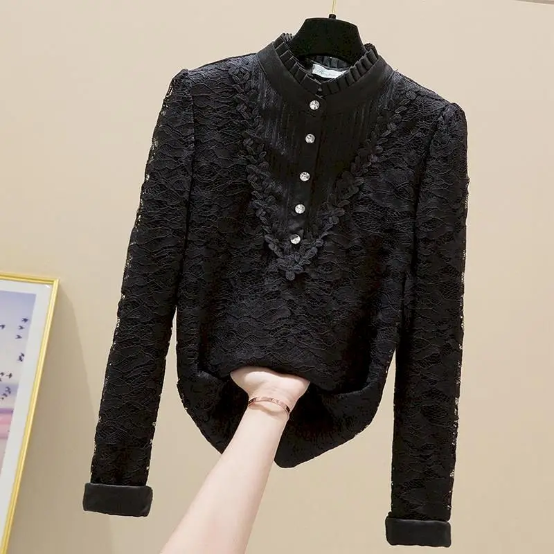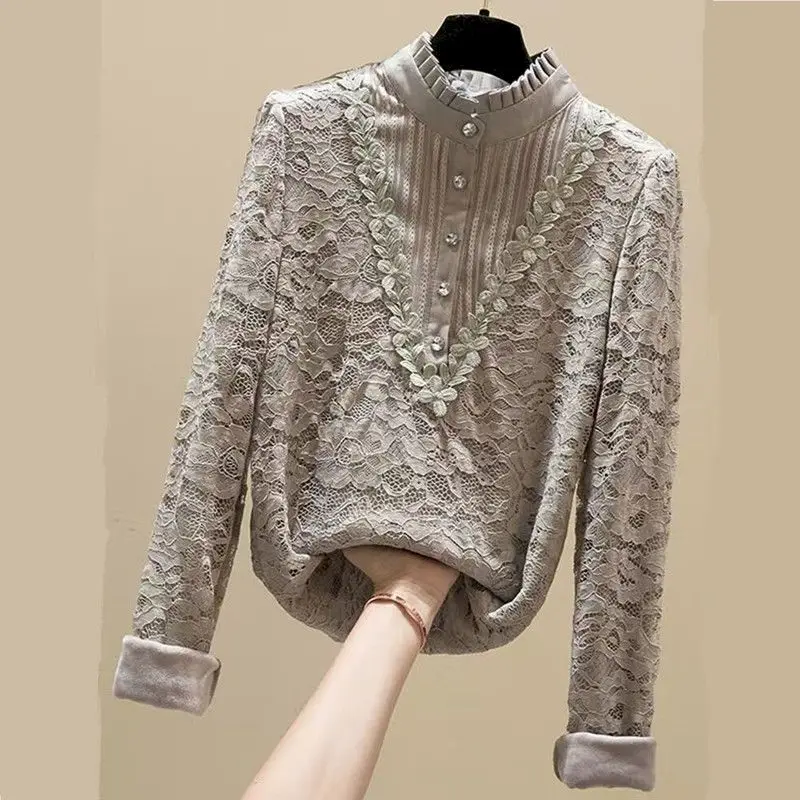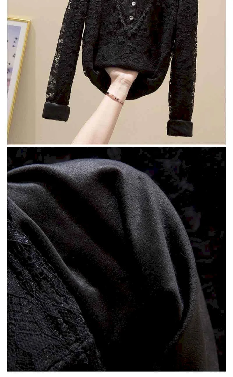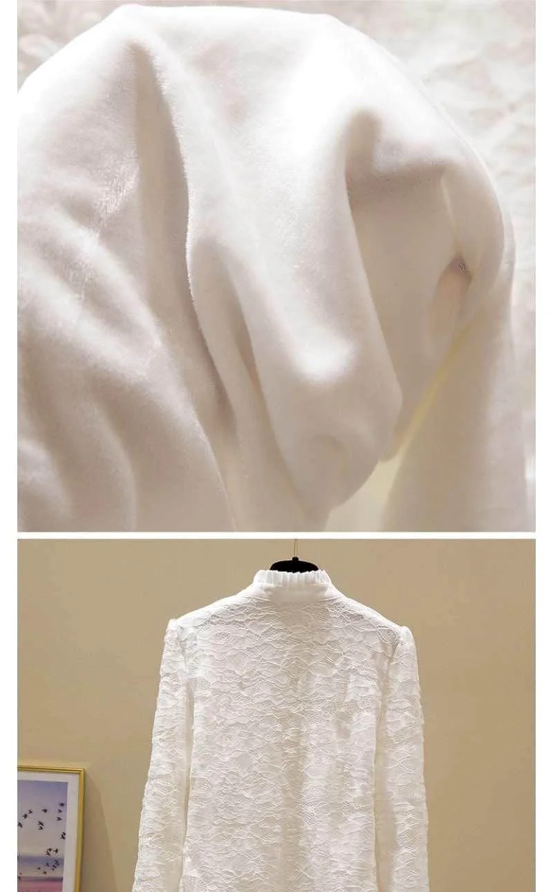Женская футболка плюс бархаттонкие весенне-зимние Новый стиль размера плюс кружево плюс толстый бархат дна рубашки половина с высоким воротником, Топ