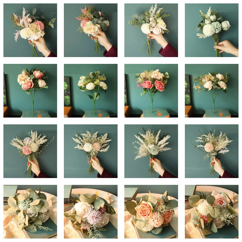 Смесь эвкалиптовых роз, искусственные цветы, зеленые растения, букеты, украшения для дома, шелк, искусственная Гортензия, свадебные цветы