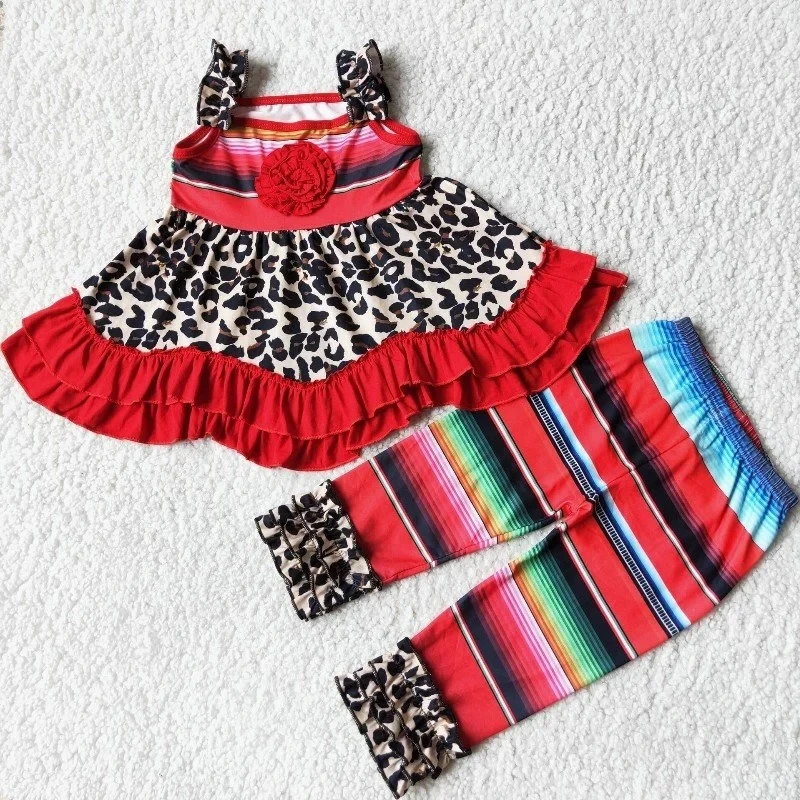 Оптовая продажа, Детские комплекты одежды для маленьких девочек, детское кружевное платье без рукавов с цветочным рисунком, модные штаны в полоску с оборками, наряд для младенцев