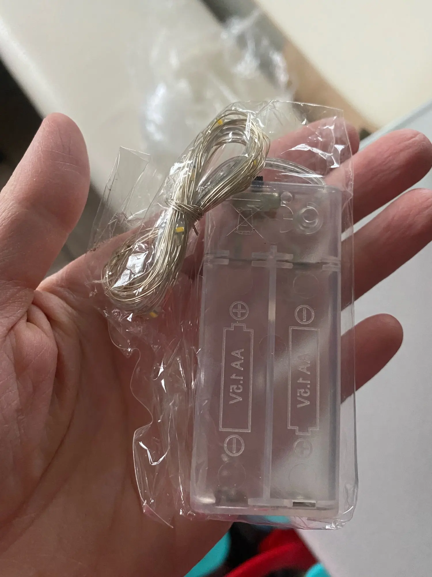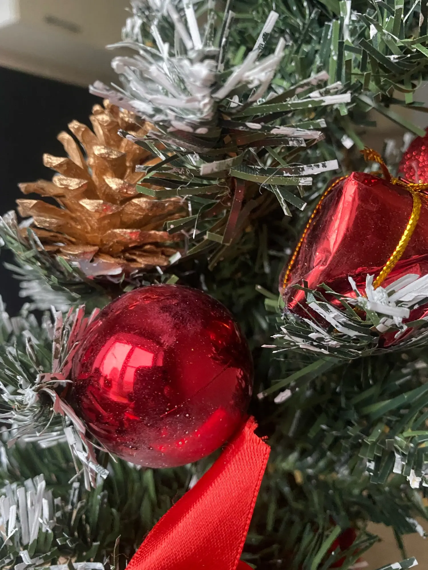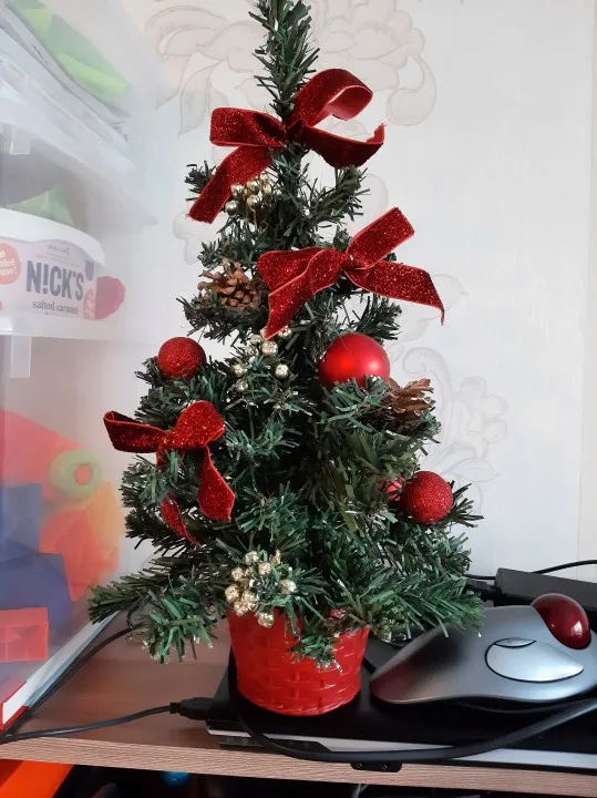 Ёлка наклонена вбок. Буду пробовать выровнять. С одной стороны немного загрязнена, какой-то белый налёт, может, краска белая попала нечаянно в виде спрея. Присутствует неаккуратность в изготовлении, но другого исполнения я и не ждала. Украшения приклеены к веткам. Присутствуют позолоченные шишки. Гирлянда отдельно, питание от батареек. В целом выглядит очень мило, праздничное настроение даст, за небольшие деньги. Положили ещё резинку для волос.