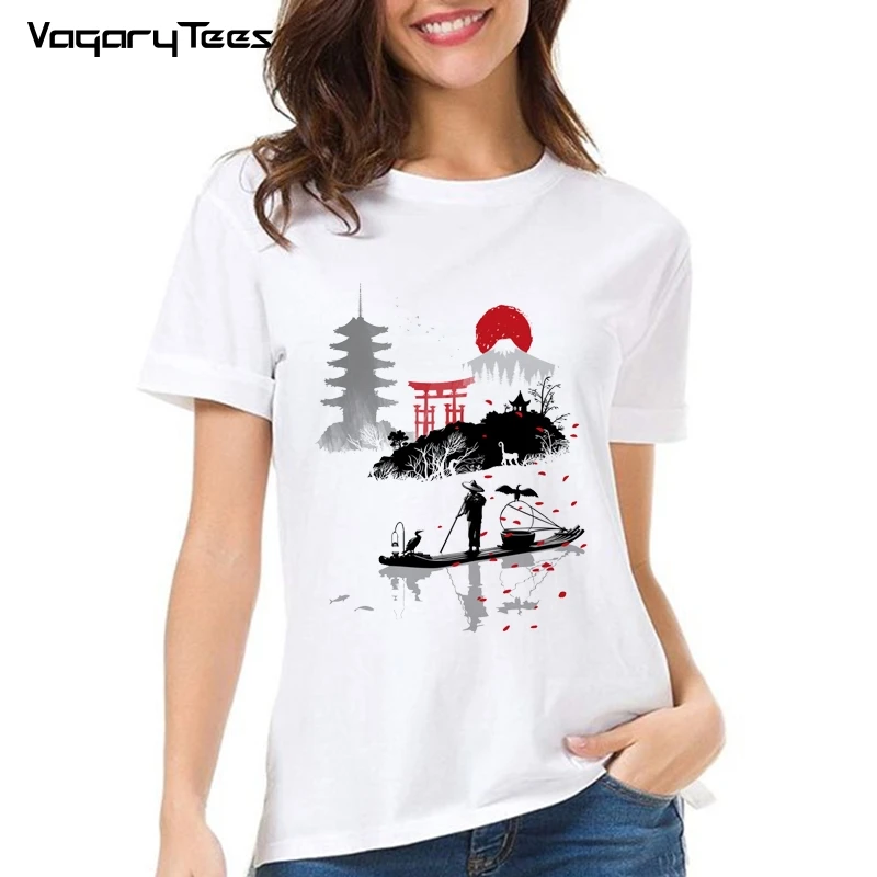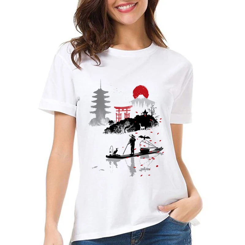 Женская футболка с принтом в стиле японских рыбаков, летняя стильная футболка с изображением природы, храма, топа