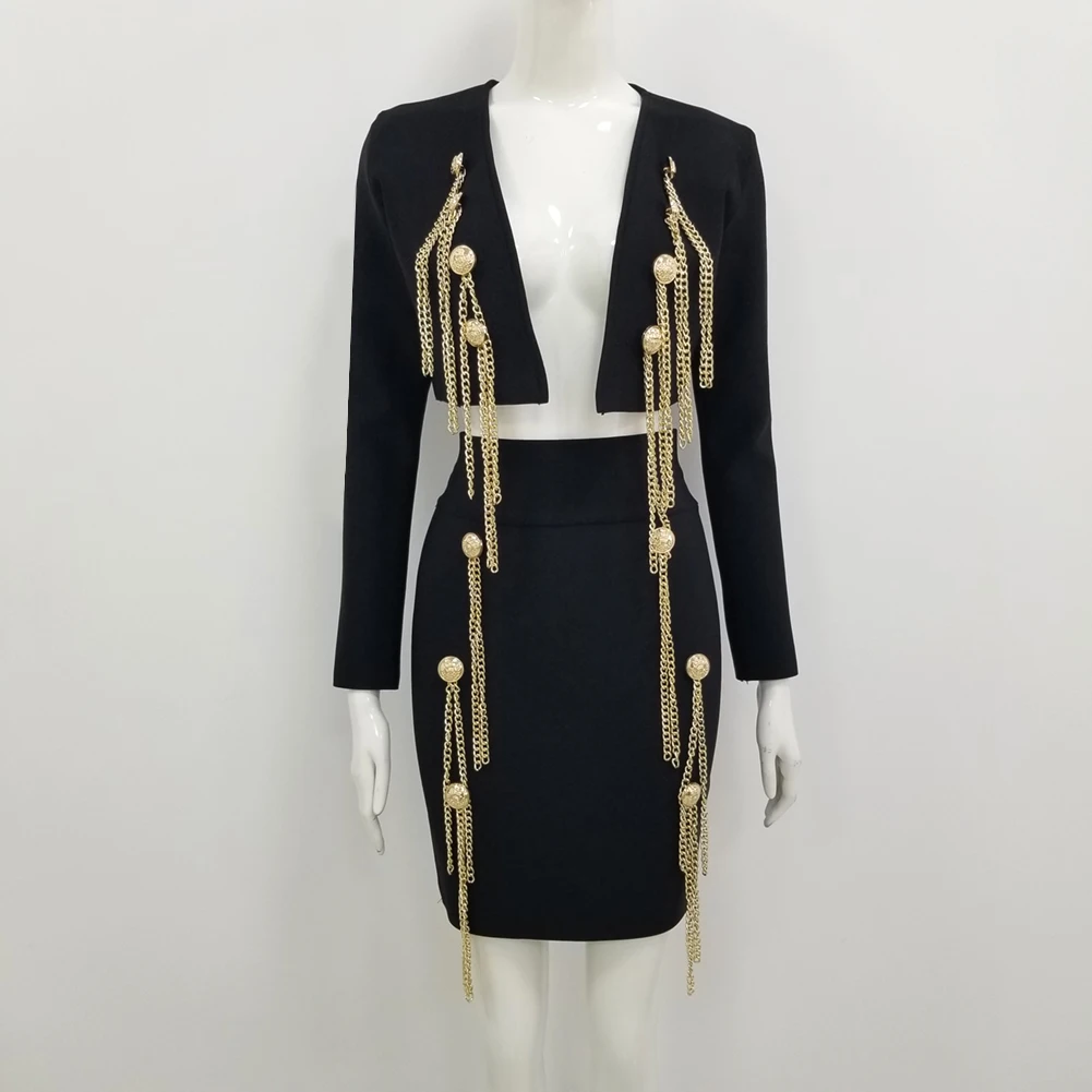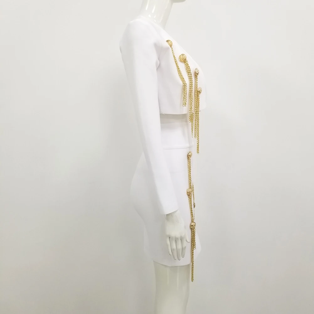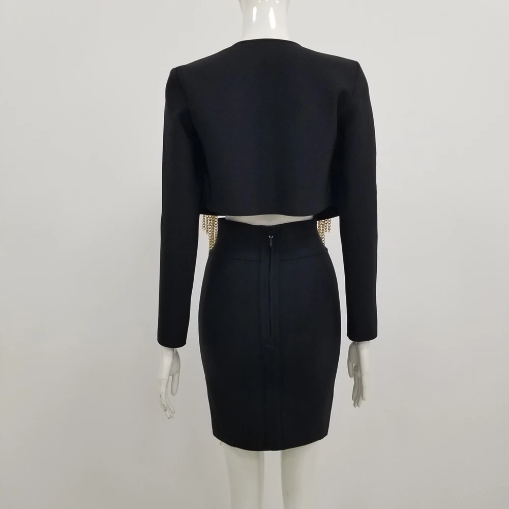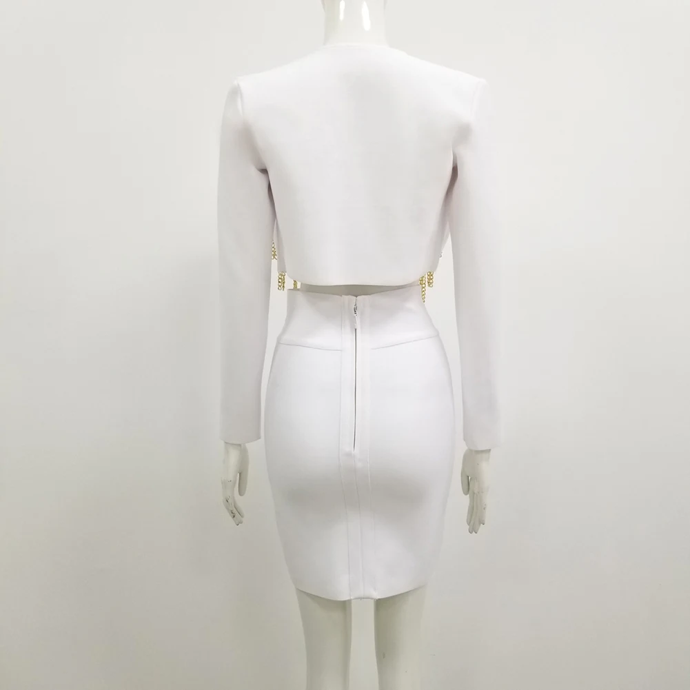 Одежда высшего качества пикантные Длинные рукава черный, белый цвет цепи из двух частей облегающее Бандажное платье 2020 дизайнер Модные вечерние платье Vestido