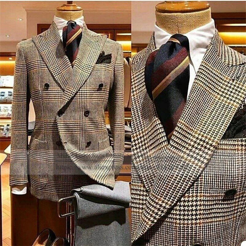 Шерсти одежды из твида с рисунком гусиные лапки Для мужчин костюмы широкий заостренными лацканами куртка 2 предмета Двубортное пальто Бизнес блейзер для свадьбы, вечерние платья