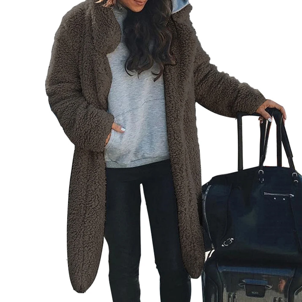 Женский зимний плотный плюшевый кардиган с лацканами, однотонный теплый кардиган средней длины с длинным рукавом