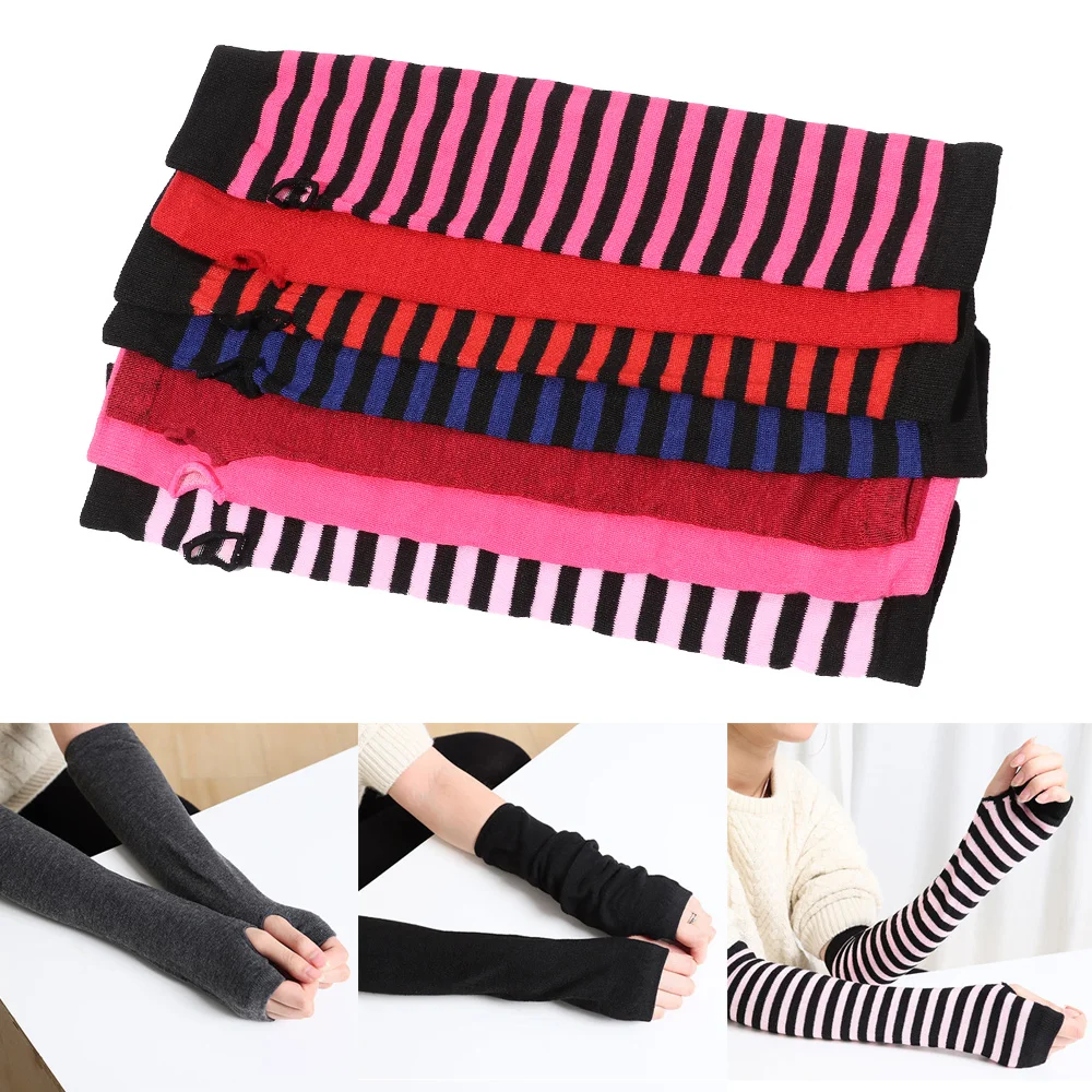 Модные женские полосатые перчатки для локтя, теплые вязаные перчатки без пальцев с длинным рукавом, варежки для локтя, утепленные нарукавники