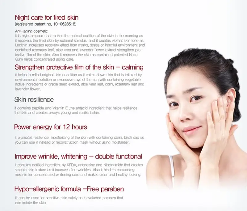 Содержит ингредиенты KFDA, аденозин и Ниацинамид, которые составляют меланин для концентрированного отбеливания, а также маски, чистые и здоровые.