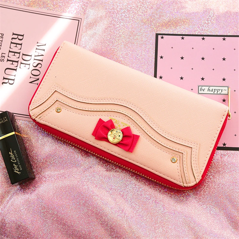 Сейлор Мун Конструктор из искусственной кожи Длинный кошелек; Женский кошелек на молнии милые сумки из натуральной кожи, дневной клатч, с украшением из жемчуга и бантов