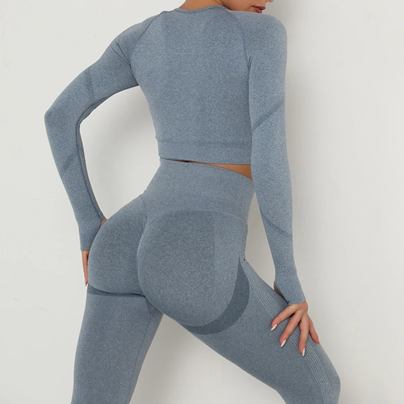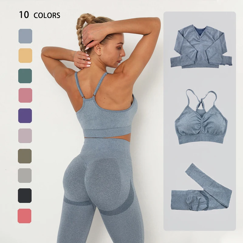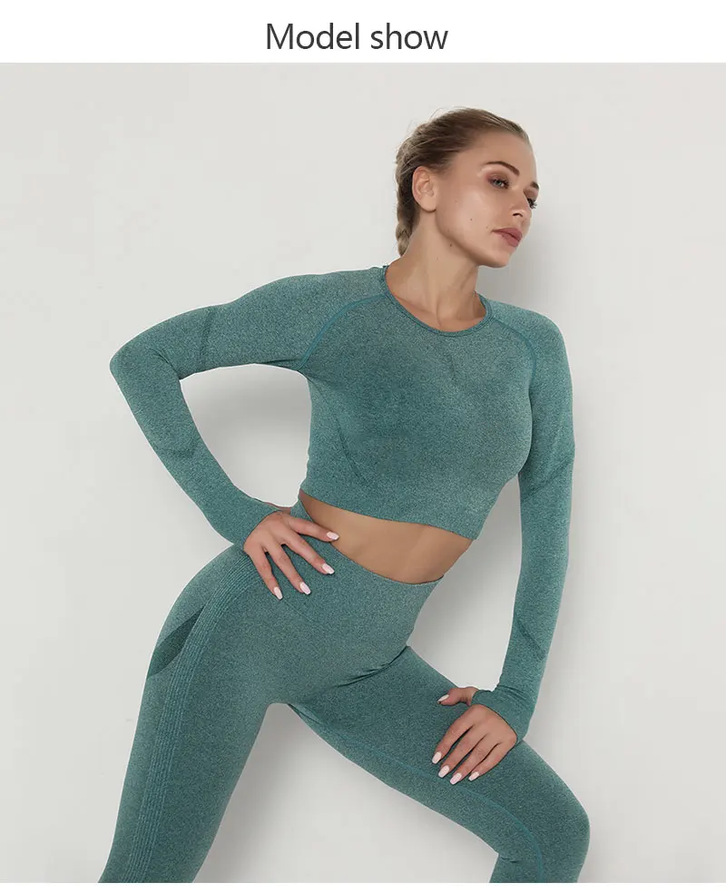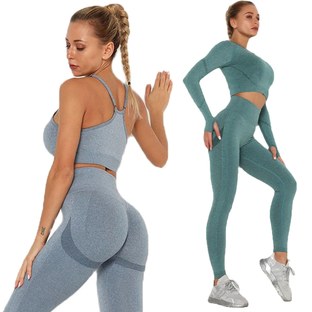 Комплект спортивный женский бесшовный для йоги, укороченный Топ с длинным рукавом и леггинсы с высокой талией и спортивный бюстгальтер