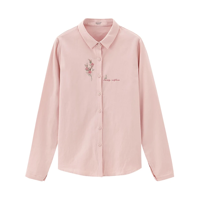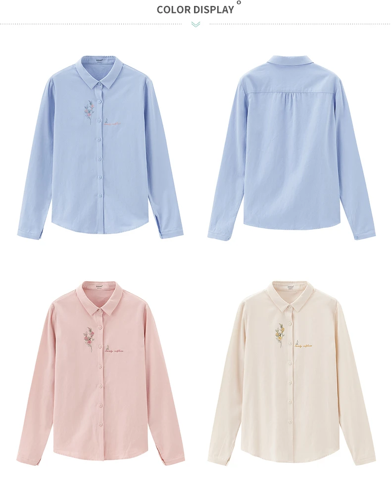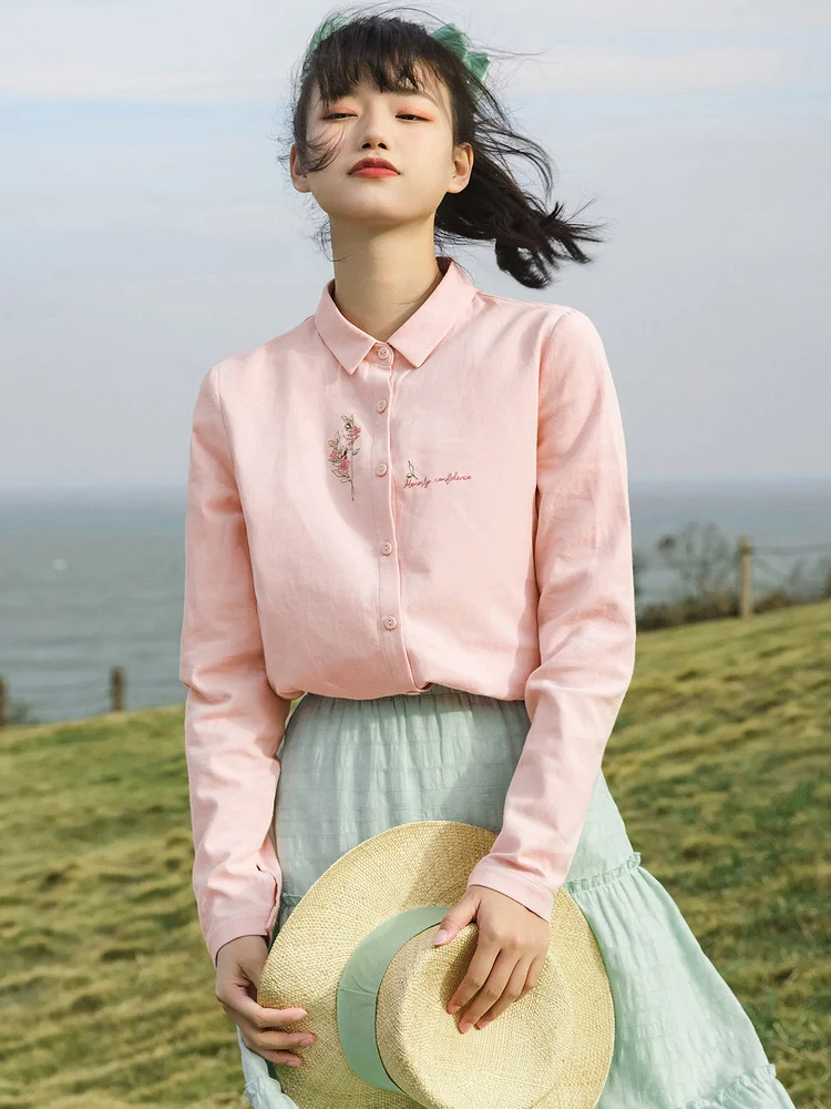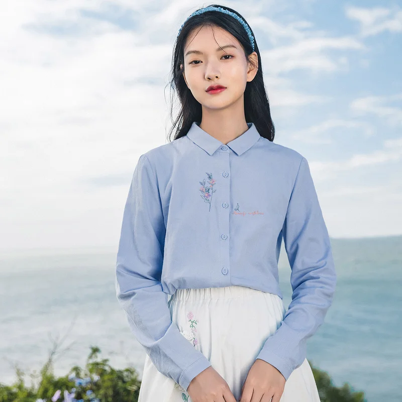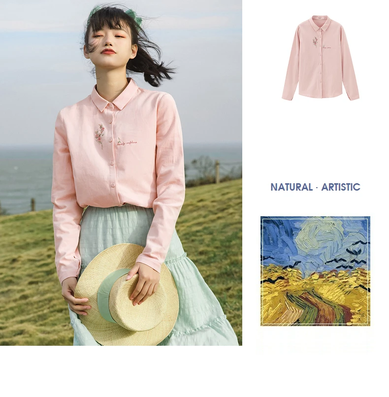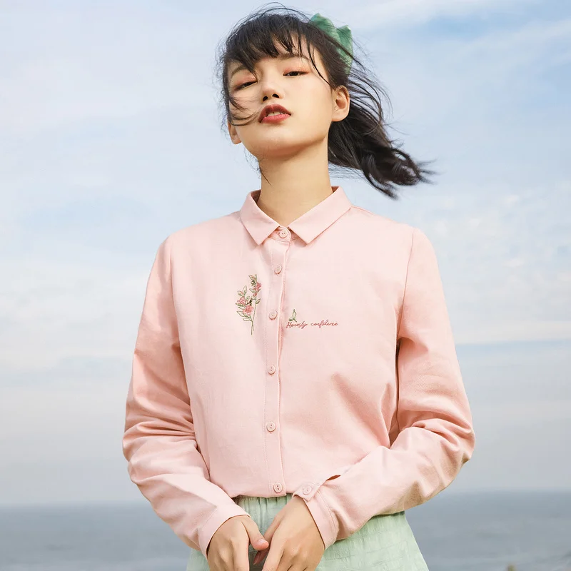 Женская Однотонная рубашка из чистого хлопка, с длинными рукавами и вышивкой