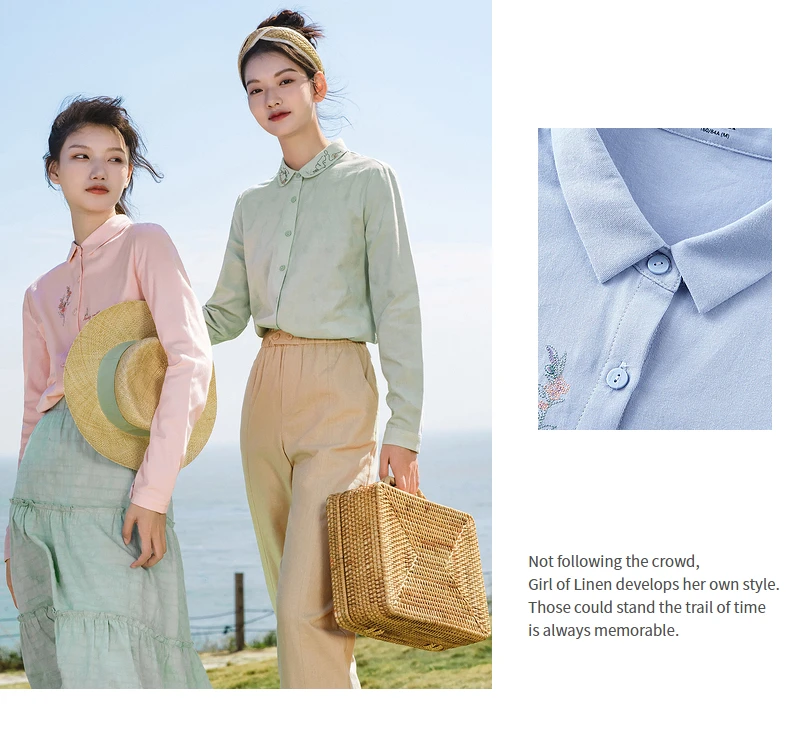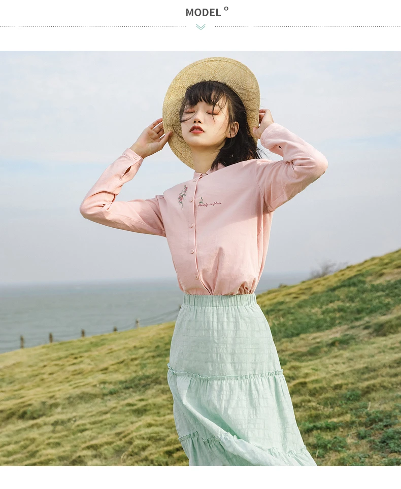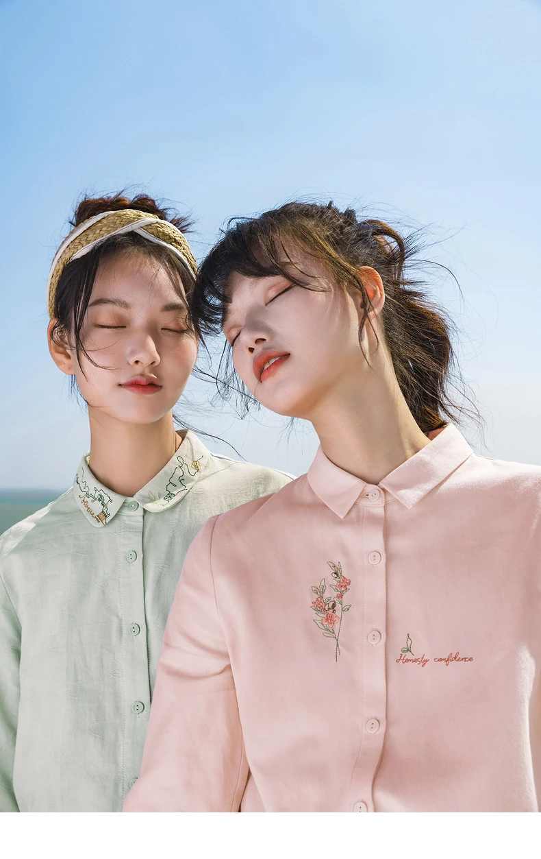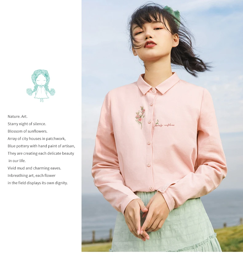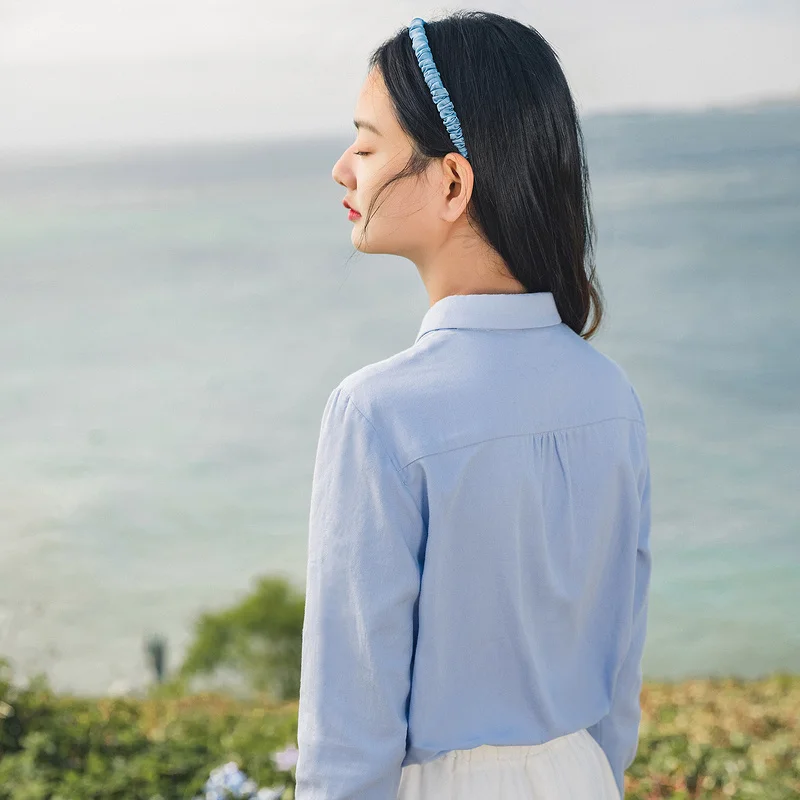 Женская Однотонная рубашка из чистого хлопка, с длинными рукавами и вышивкой