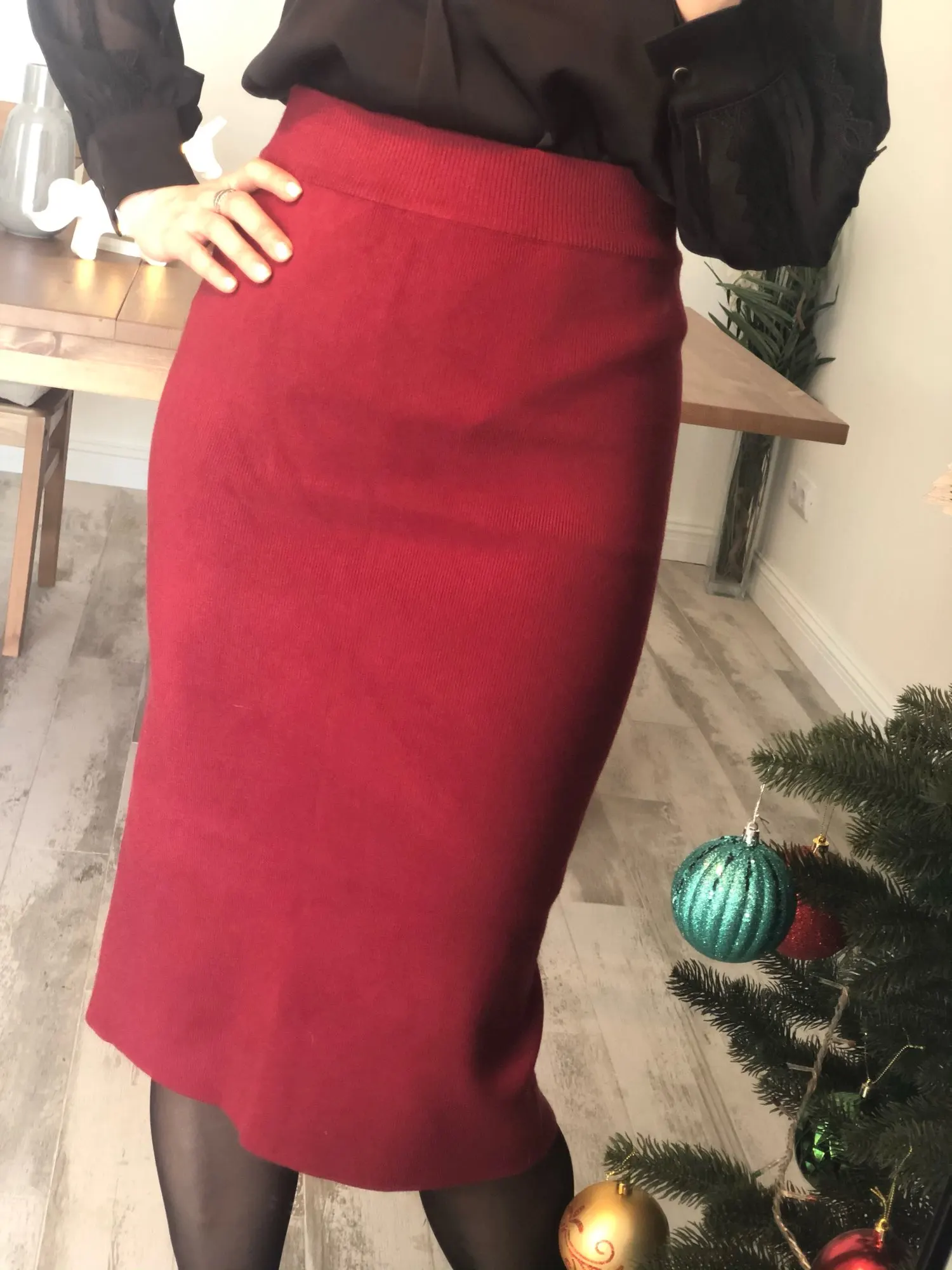 Юбка модели карандаш, на широкой резинке, сзади имеет небольшой разрез. Ткань плотный трикотаж, на ощупь мягкая, приятная. По составу материал: полиэстер, хлопок. Вязка машинная, аккуратная, лицевой плотной гладью. Качество выполнения высокое.На свои параметры: рост 165см, 87-68-90 я выбрала размер М, сел отлично, в бёдрах и талии есть запас, если хотите чтобы юбочка села в обтяжку берите на параметры подобным моим размер S. Срок доставки в Россию составил 19 дней, юбка была отлично упакована в почтовый и зип/пакет. Покупкой своей я очень довольна, прекрасная юбочка совсем недорого.