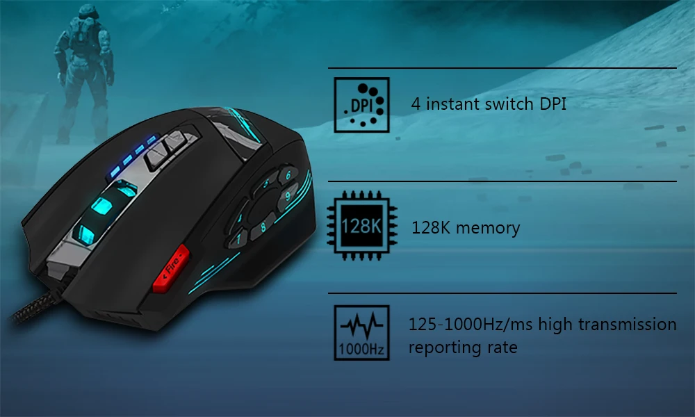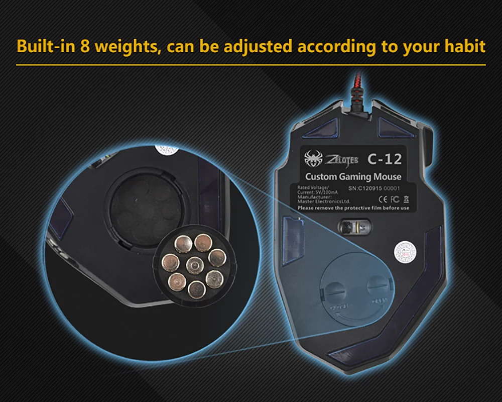 Особенности:Поддержка 4 уровня DPI, 1000-1500-2000-4000 4 уровня DPI Переключатель, поддержка двойной скорости регулировки, максимальная скорость движения мыши до 8000DPI.12 программируемых кнопок, импульсный светильник в 6 цветовых режимах.Функция быстрого большого пальца: 6 программируемых одиночных клавиш для отличного игрового представления.Светодиодный светильник, режим вспышки, 7 цветов, эффект дыхания, обеспечивает прохладный внешний вид.Клавиша Fire, тройная Кнопка нажатия справа, более удобная для вас, чтобы получить тройной щелчок, поможет вам получить быструю скорость, чем у других игроков в игре.Встроенный 8 весов, может быть скорректирован в соответствии с вашей привычкой.Высокая-конец 1,8 м с оплеткой из нержавеющей стали-волоконно-оптического кабеля с позолоченным usb-разъемом для максимальной долговечности и точности сигнала.Отличный эргономичный дизайн, длительное использование без усталости.Совместимость с Windows 7, Windows 8, Windows XP, Vista, ME, 2000, Mac OS и другими ОС.Характеристики:Материал: АБС-пластикЦвет: черныйТип подключения: проводнойТип интерфейса: USBКабель Длина: 1,8 мРазрешение: 1000DPI, 1500DPI, 2000DPI, 4000DPIКоличество клавиш: 12 клавишЧастота опроса: 125-1000Ключевая жизнь: 12 миллионов разРежим работы: фотоэлектрическийСистема отслеживания: оптическаяУскорение: 24 гПосылка Размер: 15,5*10,5*5 см/6,1*4,1*1,9 дюймовПосылка Вес: 300 г/10,5 ozПримечание:Цвет реального товара может показать прицел отличаться из-за разных условий съемки светильник и настроек экрана монитора.Посылка:1 * Проводная оптическая игровая мышь1 * Руководство пользователя1 * CD1 * коврик для ногСсылка для скачивания дисков: http://www.zelotes.cn/en/