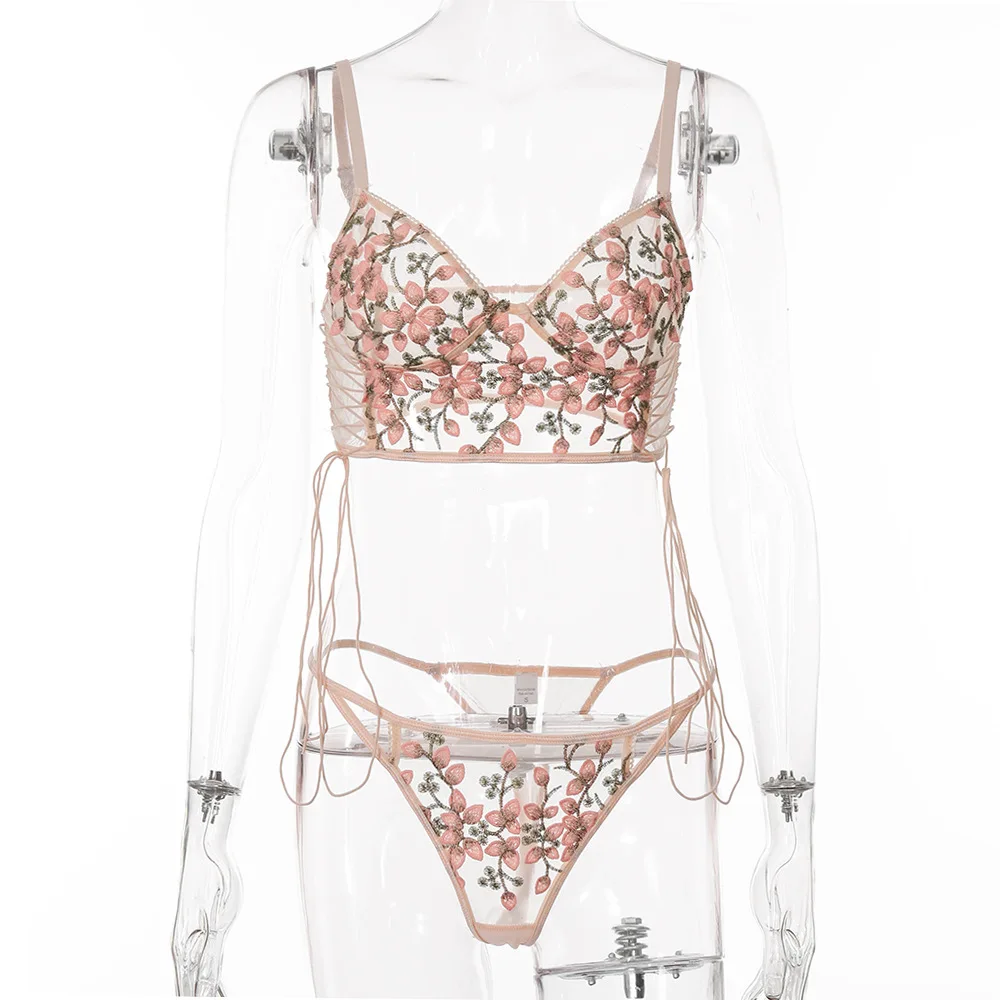 Комплект женского нижнего белья из бюстгальтера и трусов, с вышивкой