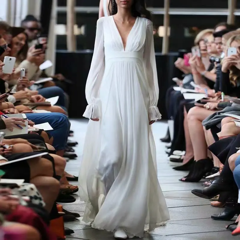 Шифоновое свадебное платье с V-образным вырезом и длинным рукавом