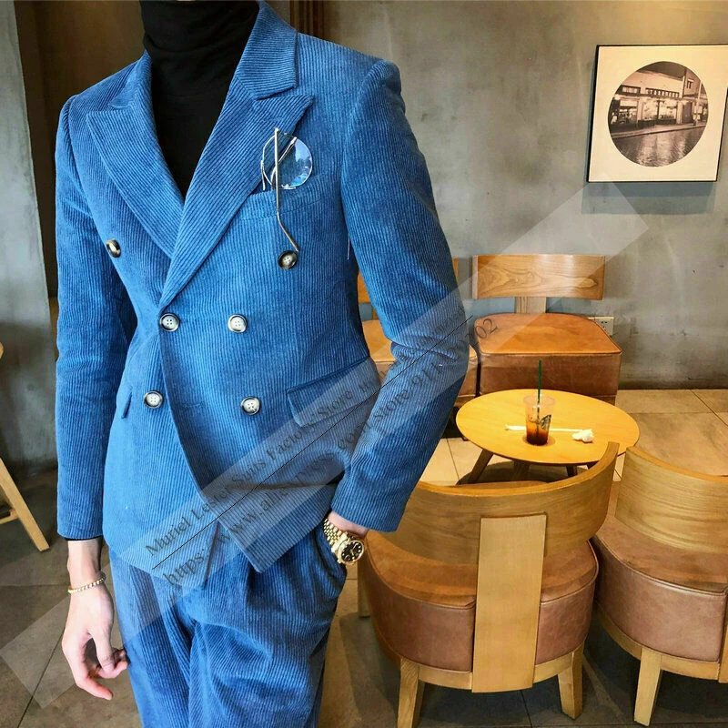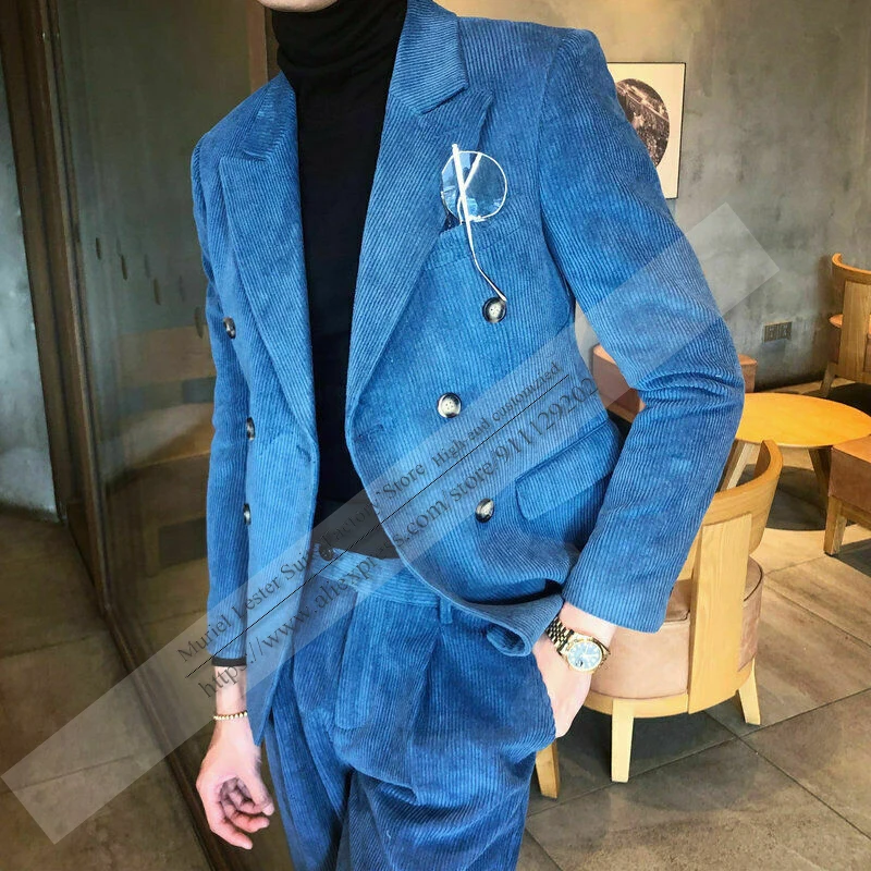 Винтаж синие вельветовые tong chongfengмужской костюм плиссированные смокинг вечерние Повседневная обувь двубортный пиджак, комплект из 2 предметов, пальто и штаны 2021 Terno