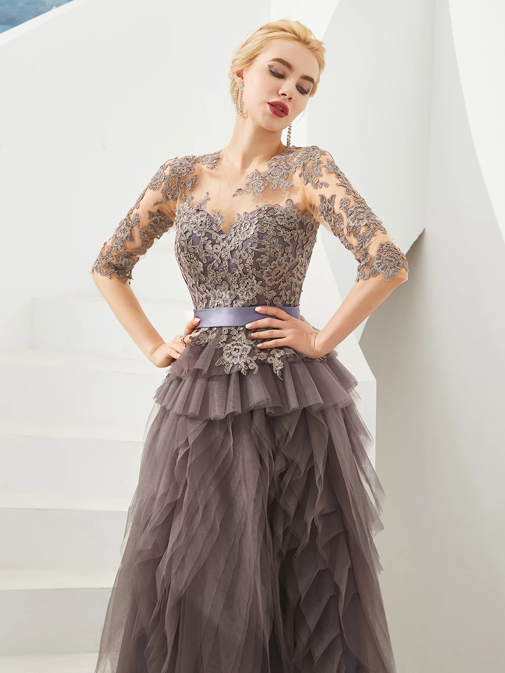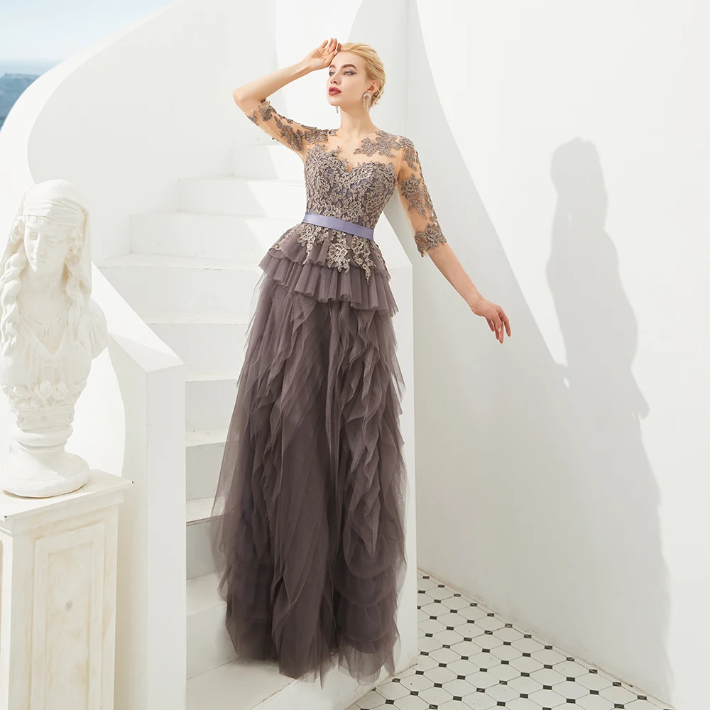 Женское Тюлевое платье подружки невесты, Длинные вечерние платья с круглым вырезом, рукавом до локтя, пуговицами, аппликацией и оборками, 2020