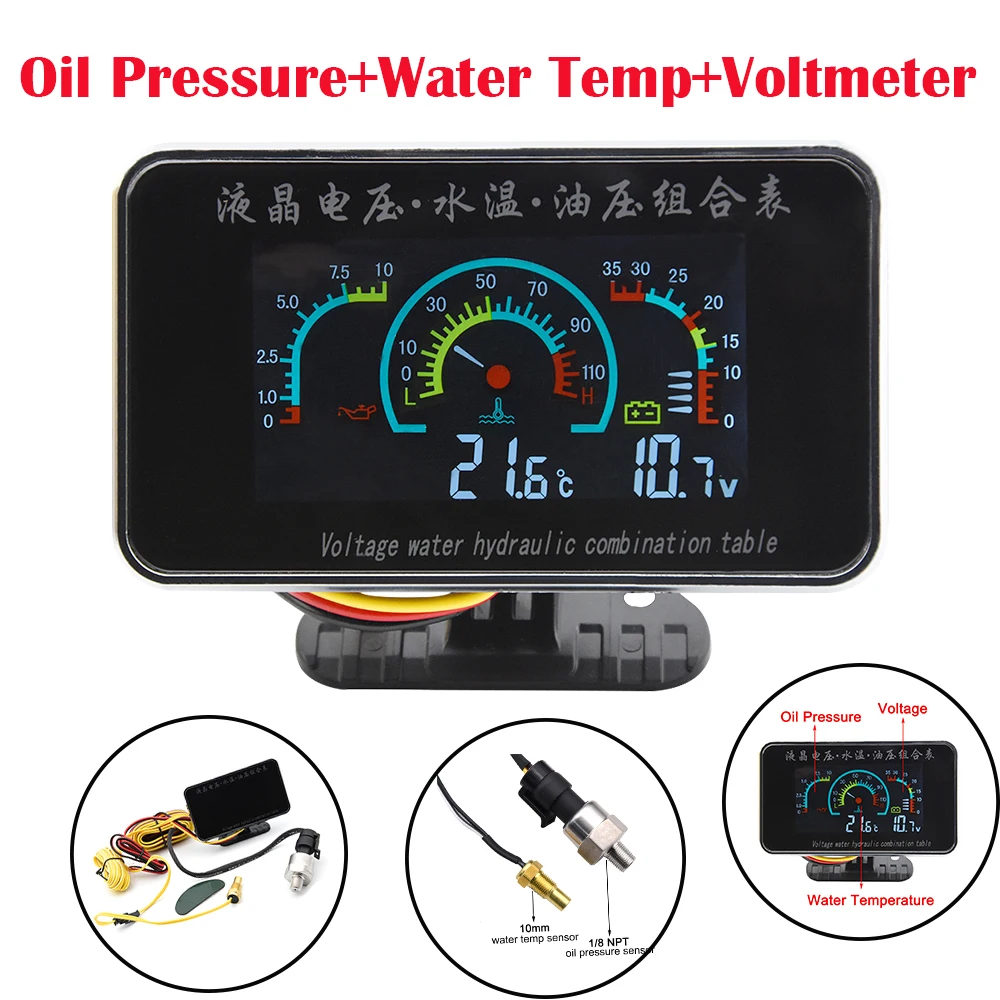 -Название: Автомобильный ЖК-дисплей 3 в 1(Температура воды/давление масла/манометры напряжения)-Материал: пластиковый корпус-Размер изделия: 55 мм * 199 мм * 14 мм-Длина кабеля питания: около 50 см-Красный --- мощность +-(Красный, черный) --- питание--Источник питания: 9 В постоянного тока-36 в-Диапазон измерения давления: 0,00-1.00Mpa-Точность: +/-1%-Измерение давления масла: (0 ~ 10)* 0.1Mpa, когда напряжение тревоги-ниже 10 В, 16-20 в, выше 31 В, будильник будет мигать.-Температура окружающей среды: -10 ℃-50 ℃-Скорость измерения: 3-5 секунд-Измеритель температуры воды: Диапазон измерения:-10 ℃-110 ℃Применение:Подходит для автомобиля, мотоцикла или по вашим потребностям!Посылка включает в себя:1 Манометр1 комплект кабеля1x датчик температуры1x датчик давления масла