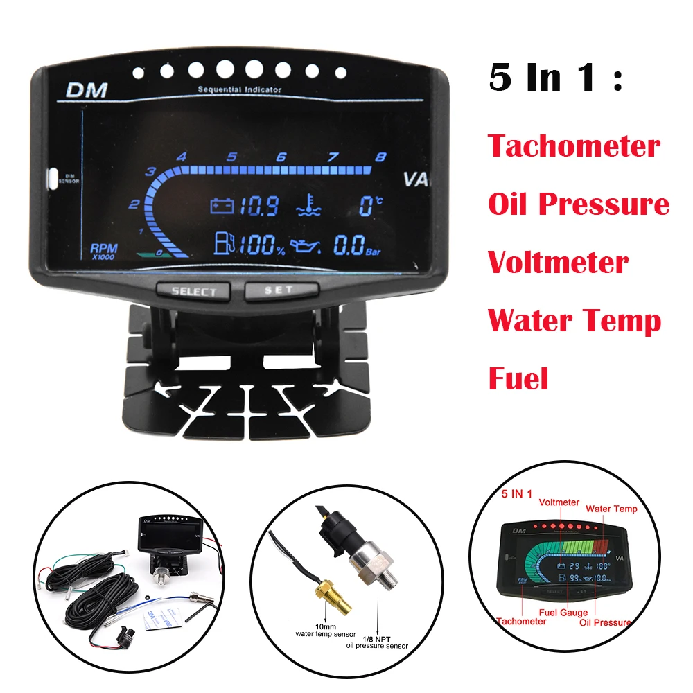 -Рабочее напряжение: 9-36 в-Диапазон температур:-20-150C-Диапазон оборотов в минуту: 0-8000 об/мин-Универсальная посадка-5 функций в 1Посылка включает в себя:1*5 в 1 Манометр2 * кабели питания1 * Датчик давления масла: 1/8 NPT1 * Датчик температуры воды: 10 мм1 * Набор аксессуаров для установки