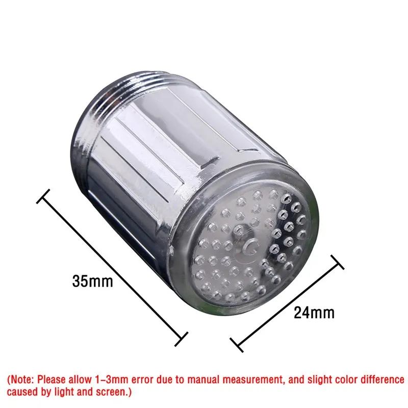 -Функция 1. Светильник активируется давлением воды и автоматически выключается водой. 2. 7 цветов не зависят от температуры воды, много цветов будет светильник случайным образом в то же время, как только вода проходит через. 3. АБС-хромовый материал, отличная коррозионная стойкость, долговечность. 3 цвета: изменение цвета напоминает вам о температуре воды. 1) синий цвет при попадании холодной воды (температура ниже 31 °C) 2) Вода светится зеленым цветом, когда вода горячая (температура 32 ° C 43 ° C) 3) Вода светится красным, когда вода горячая (температура выше 44-50 ° C) (Примечание: обратите внимание, что шум является нормальным во время рабочего процесса.) -Спецификация Интерфейс Размер: M24 * 1 мм (23,5 мм составляет 6-точка кран) fine-tooth с наружной резьбой, в том случае, если вам нужно, чтобы конвертировать в своей Интерфейс, вам нужен переходник Размер изделия: длина 35 мм внешний круг 24 мм Количество светодиодов: 1 шт. Цвет корпуса: как показано Материал: АБС-пластик Обработка поверхности: Гальваническое покрытие -Посылка включает в себя Светодиодный светильник для крана * 1