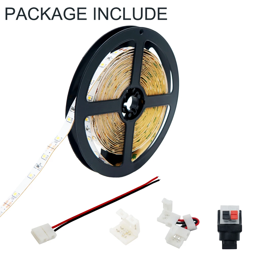 Пакет включает в себя:1x 16.4ft/5 м 300 светодиодов/рулон ультратонкое естественное освещение CRI 95 SMD2835) Светодиодная лента с usb-питанием1x DC 2,1*5,5 мм гнездовой светодиодный клеммный разъем1x полоса для полосы перемычки светодиодный разъем1х лента для светодиодной ленты1x полоса для провода светодиодный разъем1x держатель провода