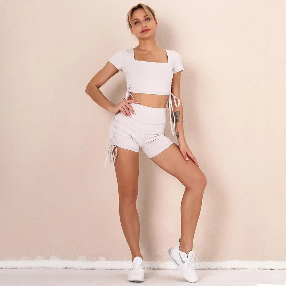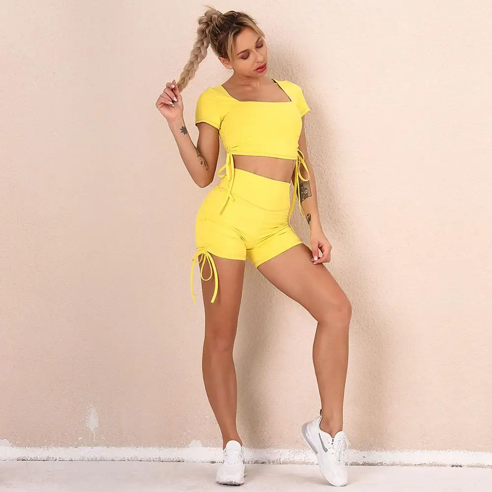 Комплект для йоги, спортивный костюм, женская одежда для йоги, бесшовный короткий топ с коротким рукавом, футболка, леггинсы, пуш-ап, для бега, тренировок, тренажерного зала