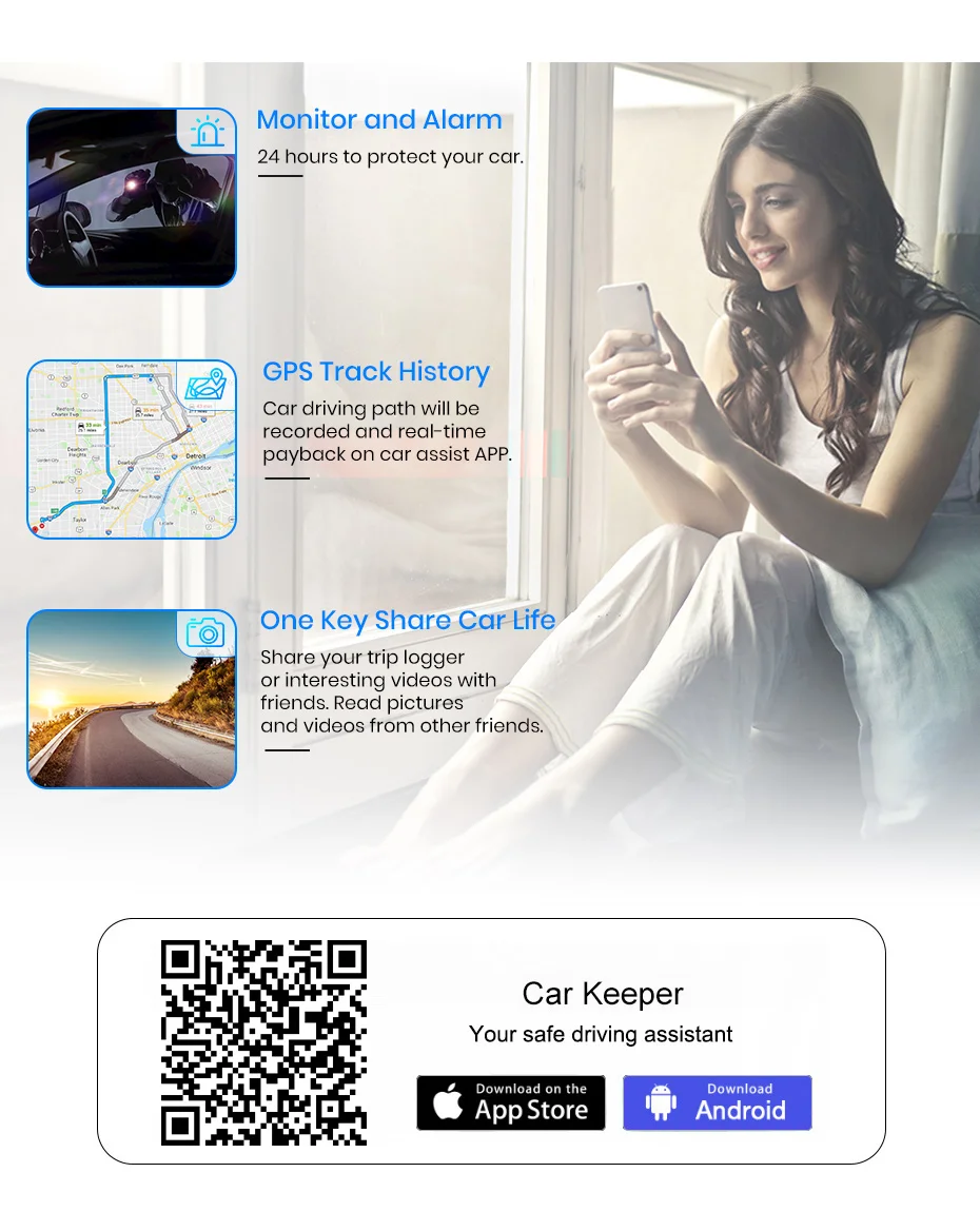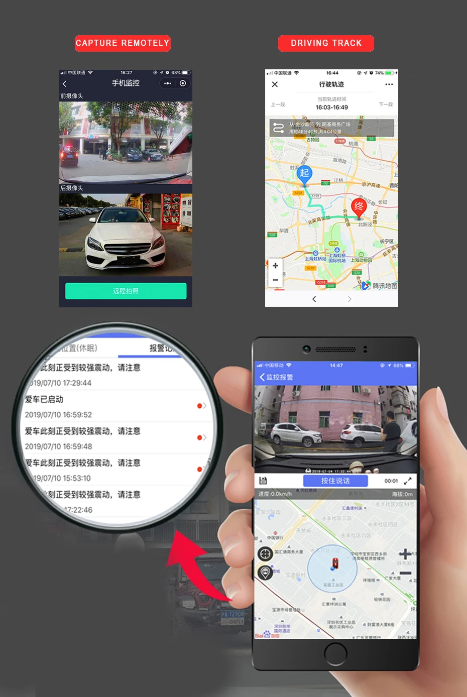 > Мониторинг и сигнализация в случае аварии автомобиля, 720P фотографии и видео 10s будут отправлены на ваш мобильный телефон в течение короткого периода времени (1-5s), И будет выдано предупреждение, чтобы напомнить вам, что «Автомобиль трясется» для защиты вашего автомобиля в течение 24 часов;