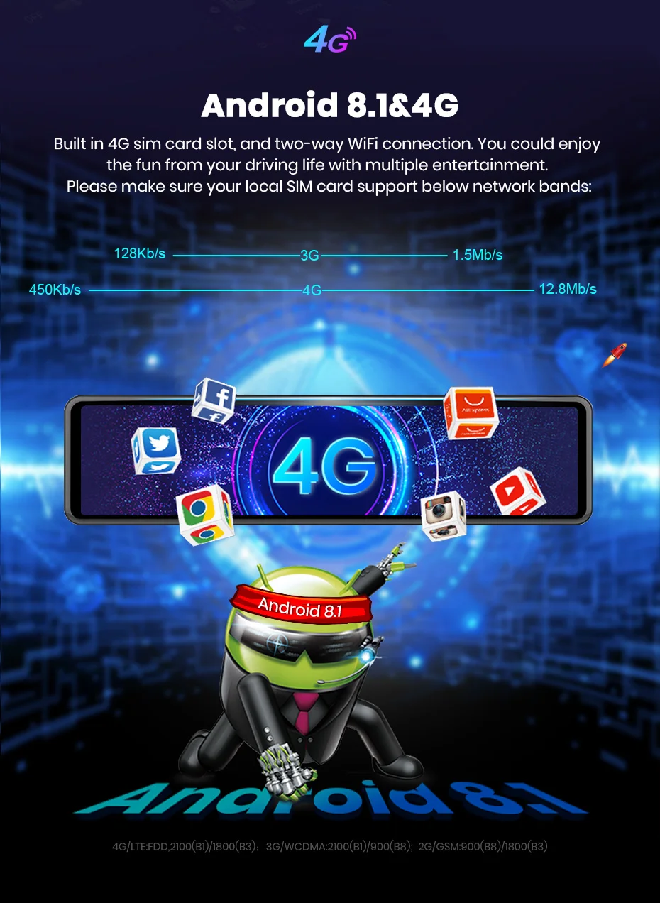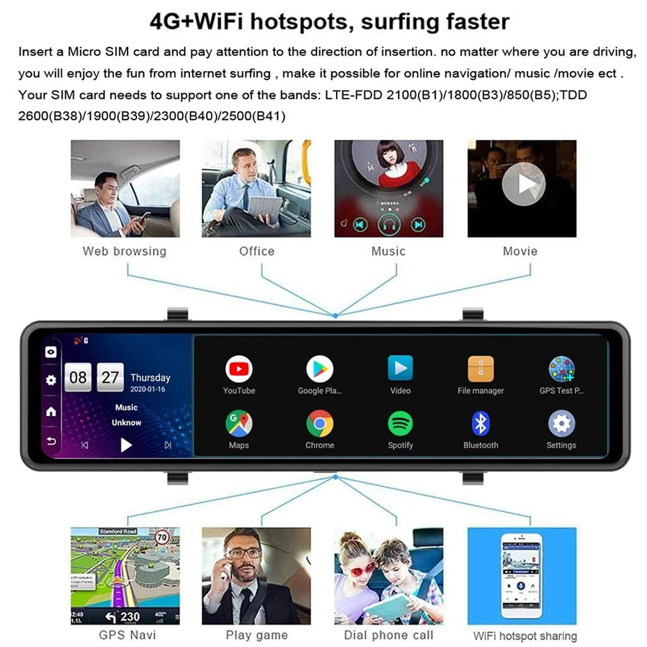 Перед заказом, пожалуйста, проверьте, есть ли у вашей локальной sim-карты 4G один из этих диапазонов: GSM: B3(1800)/B8(900) WCDMA : B1(2100)/B8(900) LTE FDD :B1(2100)/B3(1800) LTE TDD: B38(2600)/B40(2300)/B41(2600) Или вы можете использовать свой мобильный телефон, чтобы поделиться точкой доступа к этому зеркалу видеорегистратор серфинг Интернет. Спасибо.Особенности и технические характеристики