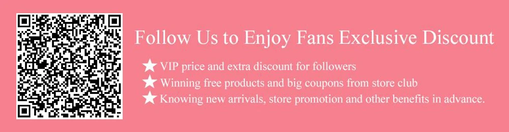 Следуйте за нами, чтобы насладиться эксклюзивной скидкой фанатов1.VIP Цена и дополнительная скидка для подписчиков2. Выигрышные бесплатные продукты и Большие Купоны от магазина club3. Зная Новые поступления, продвижение магазина и другие преимущества заранее.