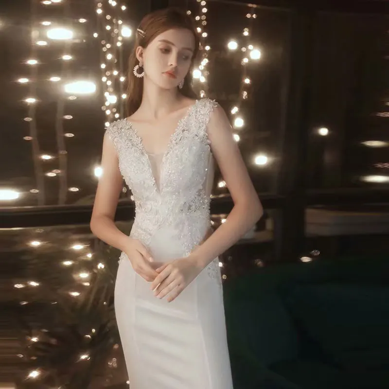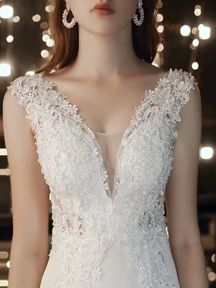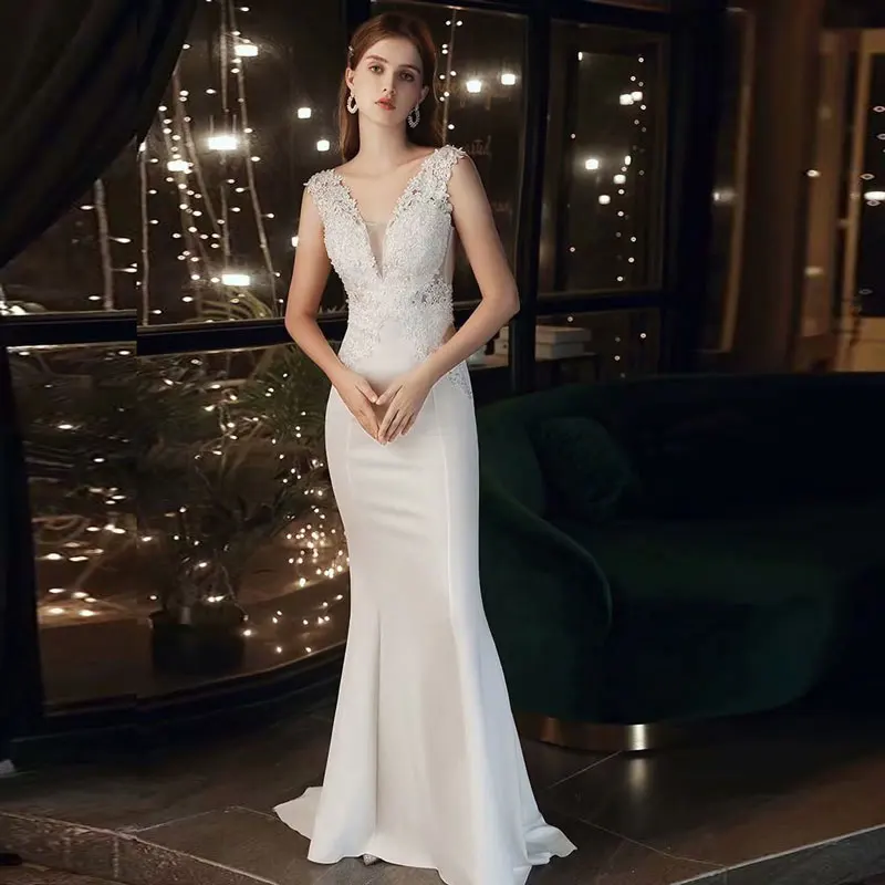 Кружевное платье-Русалка с аппликацией, свадебное платье, вечерние платья с V-образным вырезом