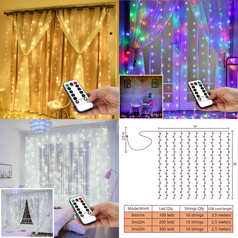 3MX3M светодиодный Шторы гирлянда вечерние фонов USB Гирлянды Гирлянда дистанционного Управление новогоднее; Рождественское украшение для дома