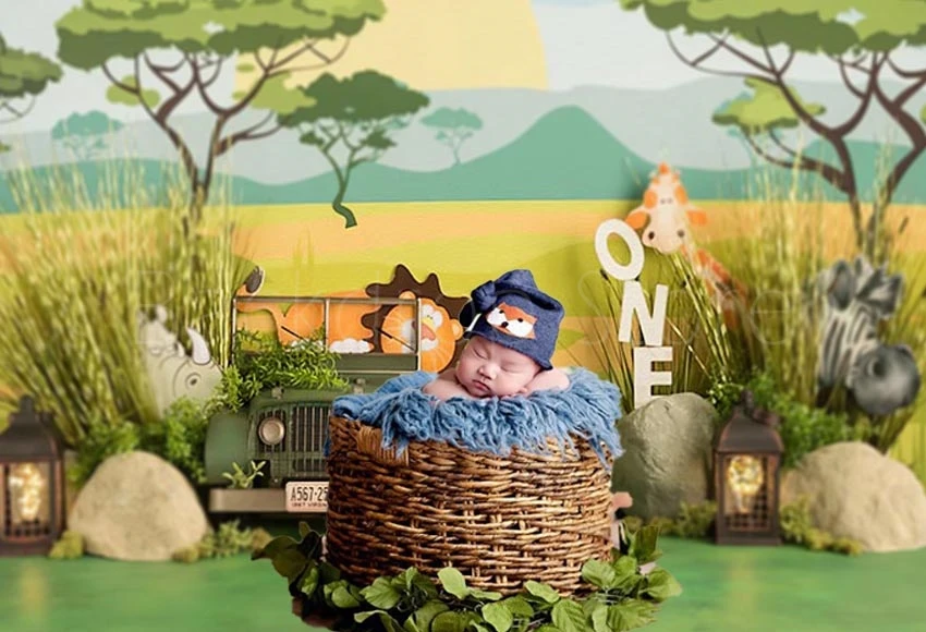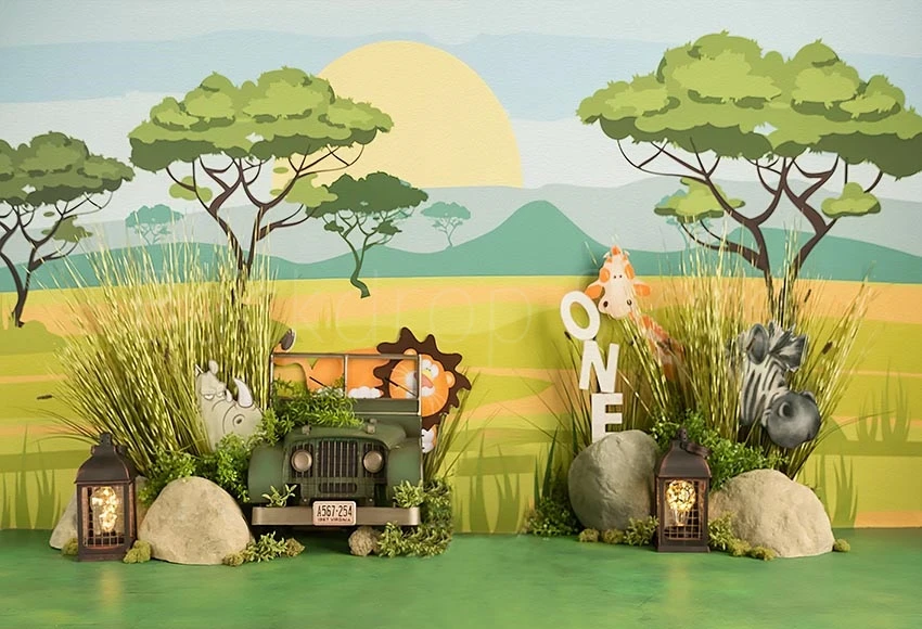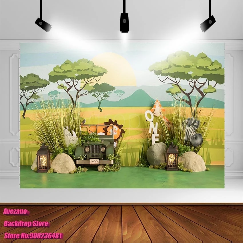 Фон Avezano для вечерние съемки с изображением леса джунглей диких животных на 1-й день рождения