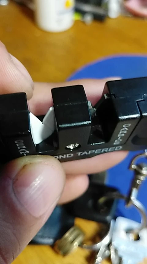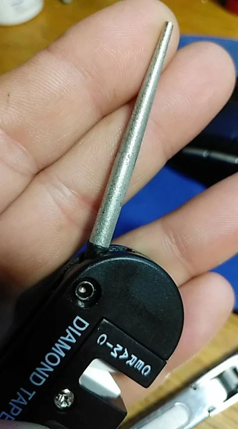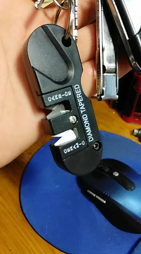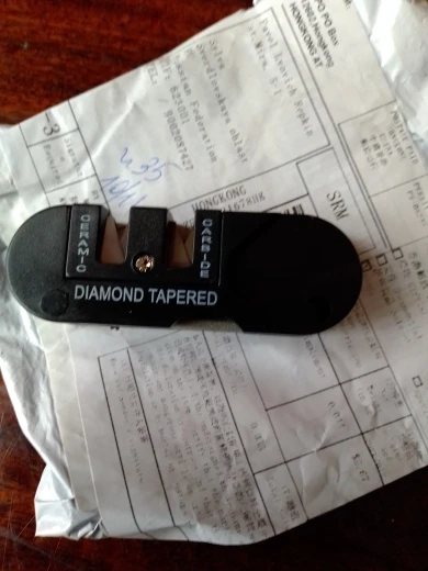 Пришло быстро. До конца не верил в эффективность (кучи подобного покупал). Но эта точилка превзошла ожидания. Снимает металл с лезвия тонкими стружками. 2-3 раза провел по металлу, так же по керамике и нож острый. Я поражен. Можно повесить на кольцо для ключей. Рекомендую.