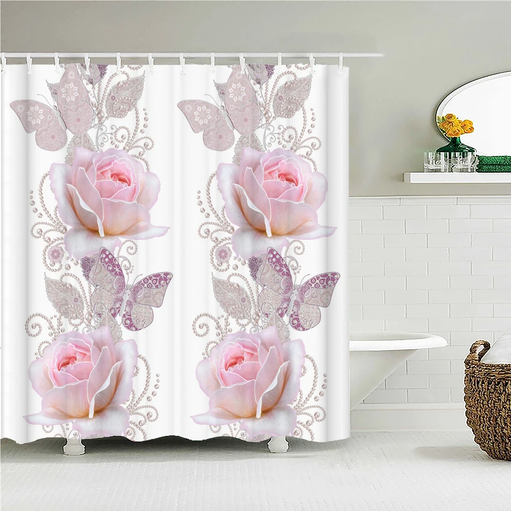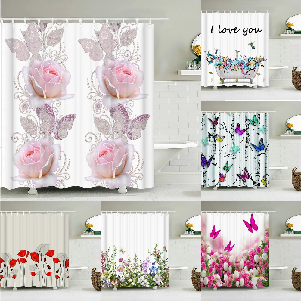 Водонепроницаемая занавеска для душа с изображением цветов и бабочек
