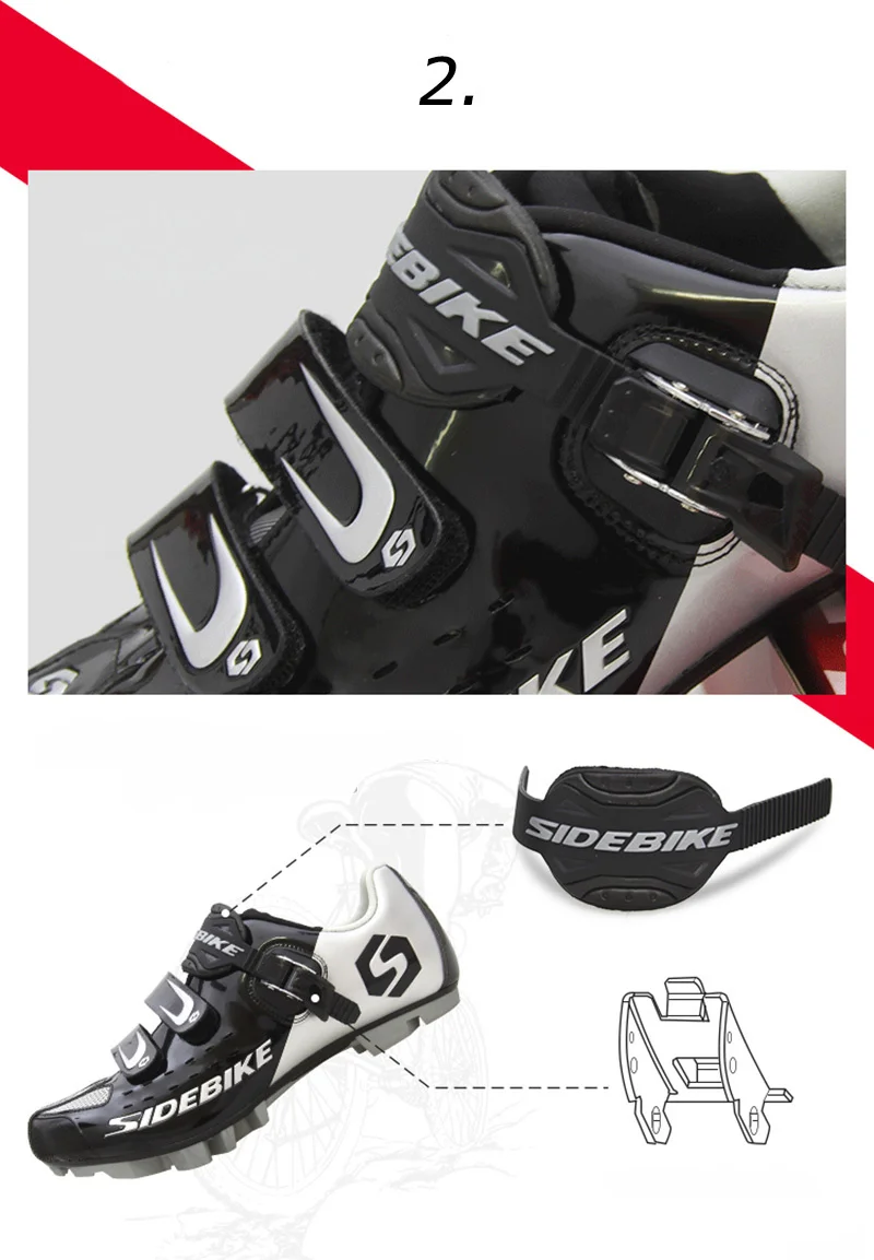 1. Нескользящая лайкра2. Логотип SIDEBIKE3. Двойной регулируемый бандаж4. Кнопка D-Link5. Дышащая сетка6. Нейлон7. Противоскользящий носок
