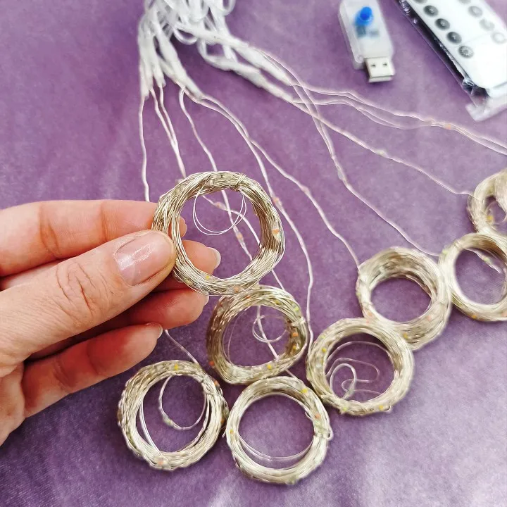 Гирлянда упакована в индивидуальный пакет. Внутри пульт для переключения режимов. Пульт приходит с батарейкой. Гирлянда состоит из проволоки-основы от которой отходят висюльки с LED лампами. Каждая висюлька свернута в моток. Гирлянда с USB- разъёмом. Вешать гирлянду очень просто. Крепим основу, а потом разматываем висюльки. Гирлянда полностью меняет и преображает облик комнаты. Такая подсветка актуальна не только для новогодних праздников, сегодня - это стильный декор, создающий невероятный уют.