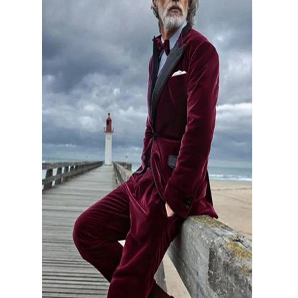 Мужские Бархатные костюмы бордового цвета, осень 2020, приталенный Блейзер с заостренным воротником, Свадебные смокинги для жениха, Мужской комплект, куртка с брюками