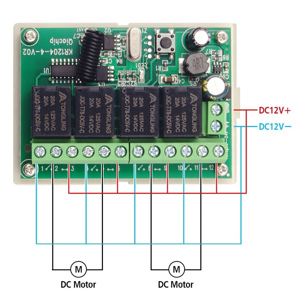 Модель: KR1204B-4Рабочее напряжение: 6-30 В постоянного токаВид продукции: 4-канальный пульт дистанционного Управление переключательРежим работы RF: ASK superгетеродинный приемРежим модуляции: ASKРежим работы: Мгновенный/тумблер/защелкивающийся и т. Д.Режим соответствия: Интеллектуальный код обучения.Ток покоя: 5 мАЧастота RF: 433 МГцВыходной ток: ≤ 10AЧувствительность приема: >104dbmИнструкции по проводке:1, +: подключение к положительному источнику питания 12 В2. - : подключение к отрицательному электроду 12 В источника питания3, A: выход; Обычно открытый конец реле4, B: выход; Реле;5, C: выход; Нормально замкнутое реле