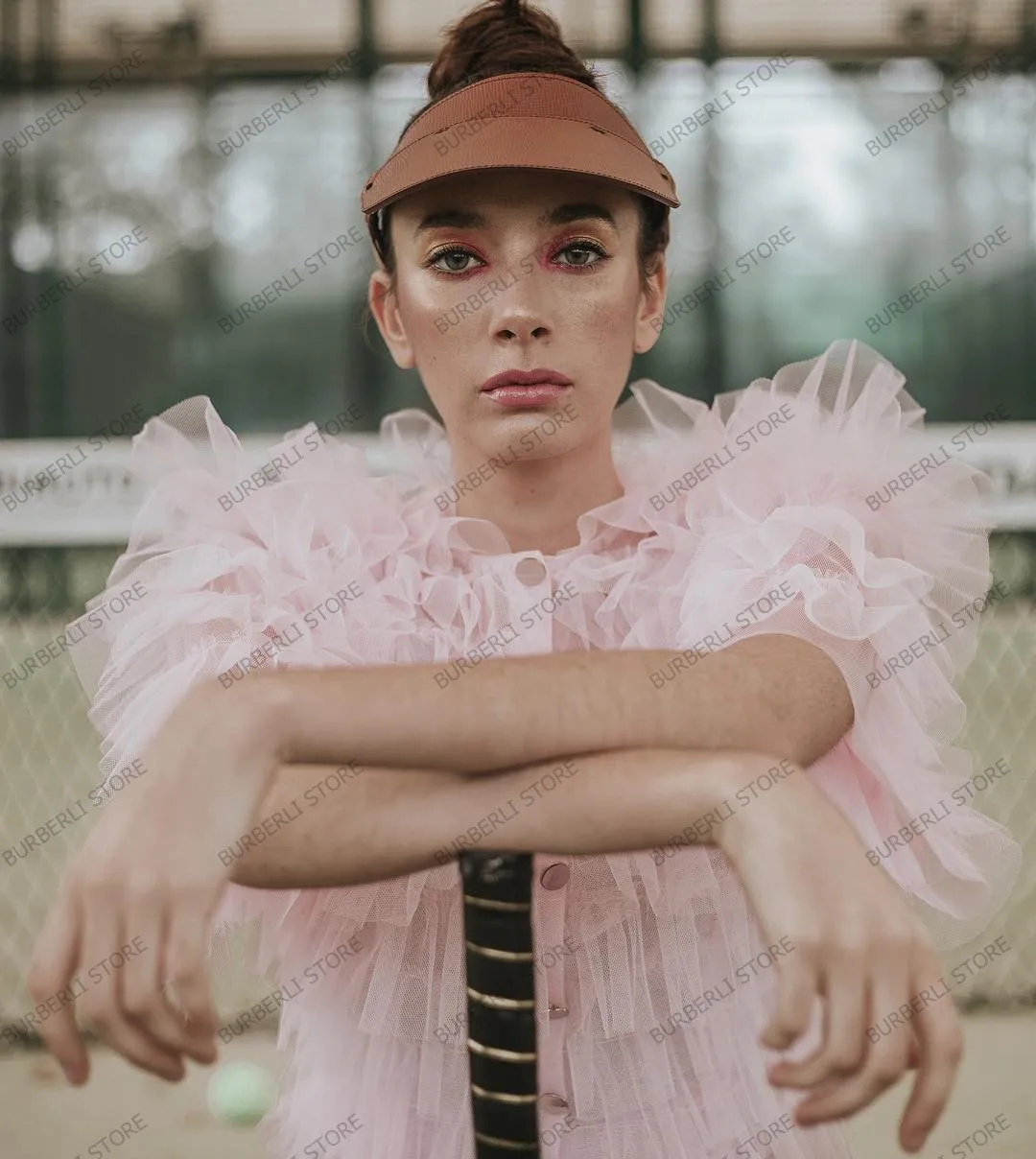 Модные женские блузки из розового тюля с оборками, женский топ из многоярусного тюля с рукавами-фонариками и пуговицами, женская одежда