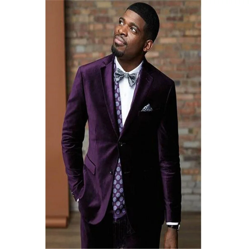 Новейший дизайн пальто и брюк, фиолетовый бархатный мужской костюм, облегающий костюм из 2 предметов, куртка для курения, смокинг, индивидуальный блейзер для жениха, костюмы для выпускного вечера, Terno