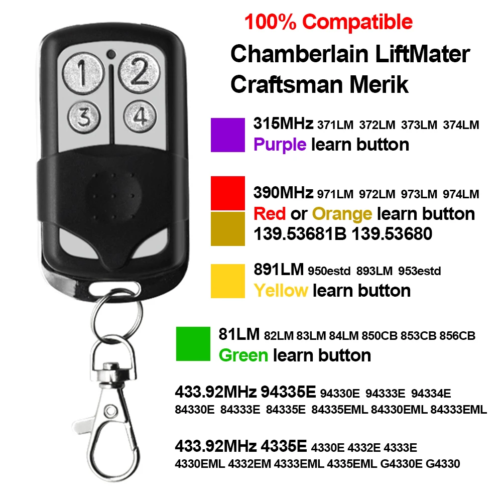 Код: 1-2-4-3 * Фиолетовая Кнопка обучения 315 МГц. * Совместимость с моделями Sears Craftsman, Чемберлен и Liftmaster. * 139,53753 Совместимость с мастером. * Функции безопасности +®Технология скользящего кода.