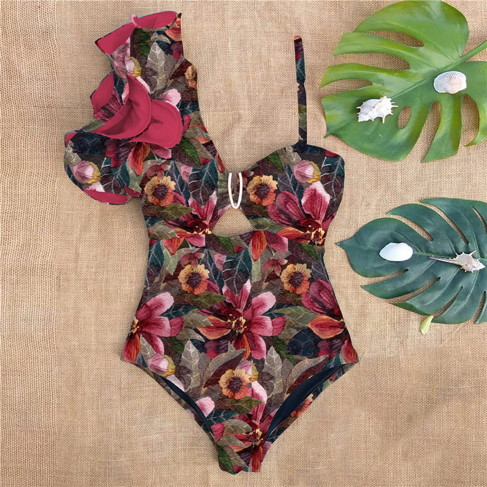 Сексуальный слитный купальник на одно плечо с оборками, купальник с цветочным принтом, женский купальник, купальный костюм, пляжная одежда, монокини