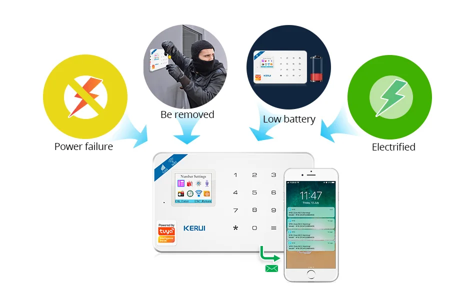 Когда детектор движения срабатывает, он будет звучать и передавать сигнал на системную панель. Хост системы сигнализации будет звучать и отправлять SMS/звонки на ваш предустановленный номер телефона. Вы получите уведомление в первый раз