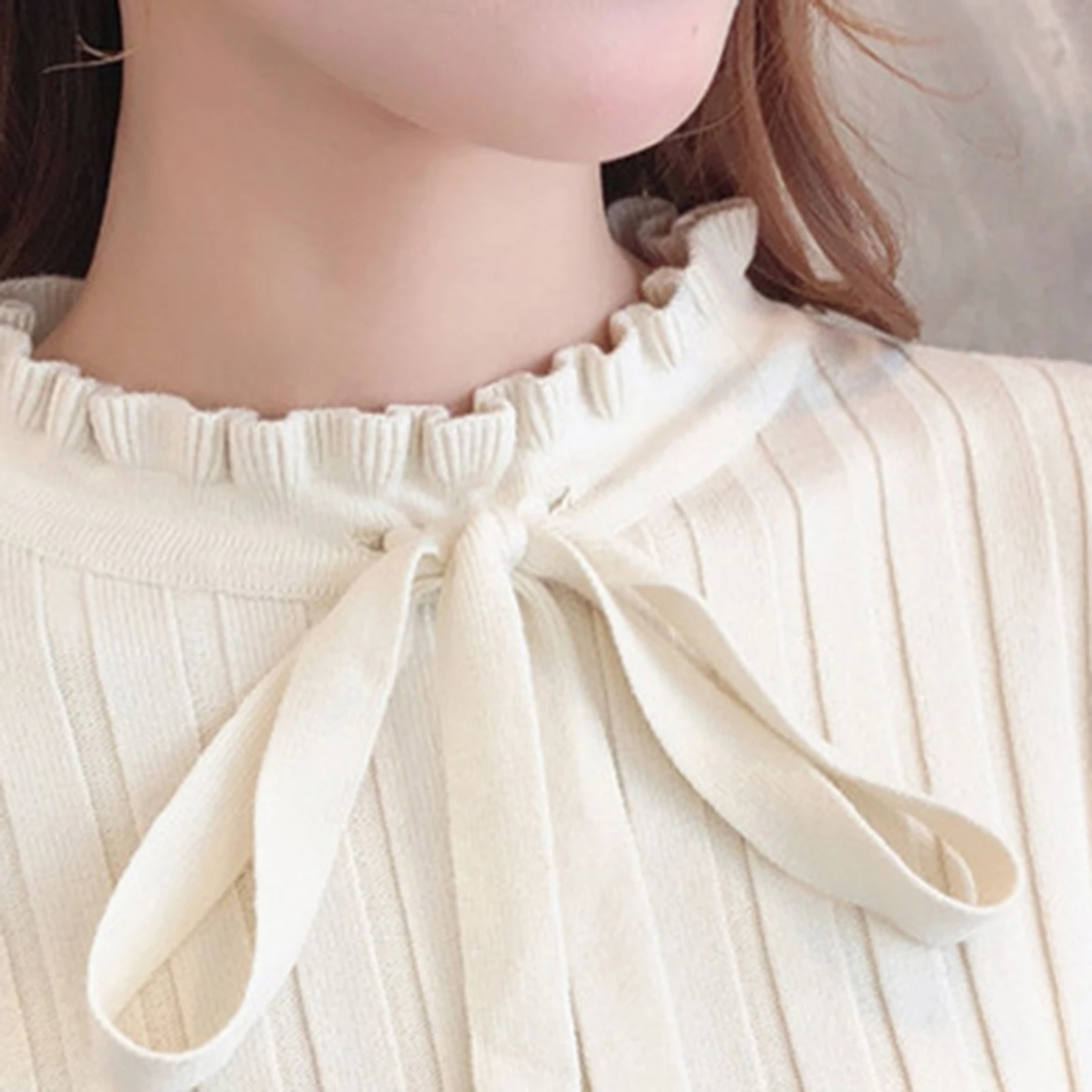 Однотонная вязаная одежда с рюшами и бантом сделает вас стильным.