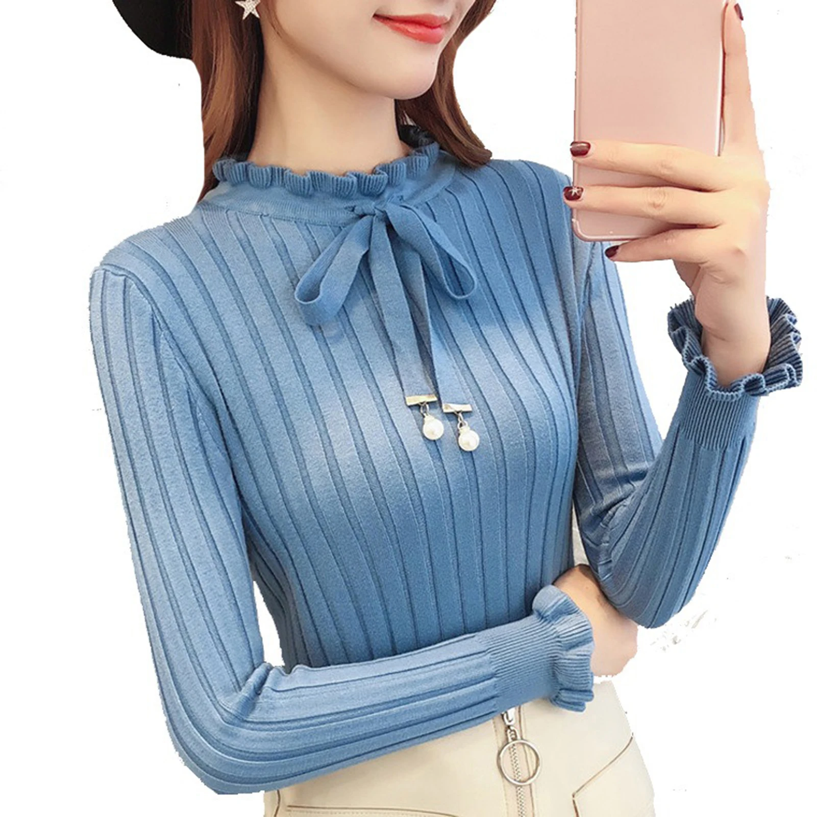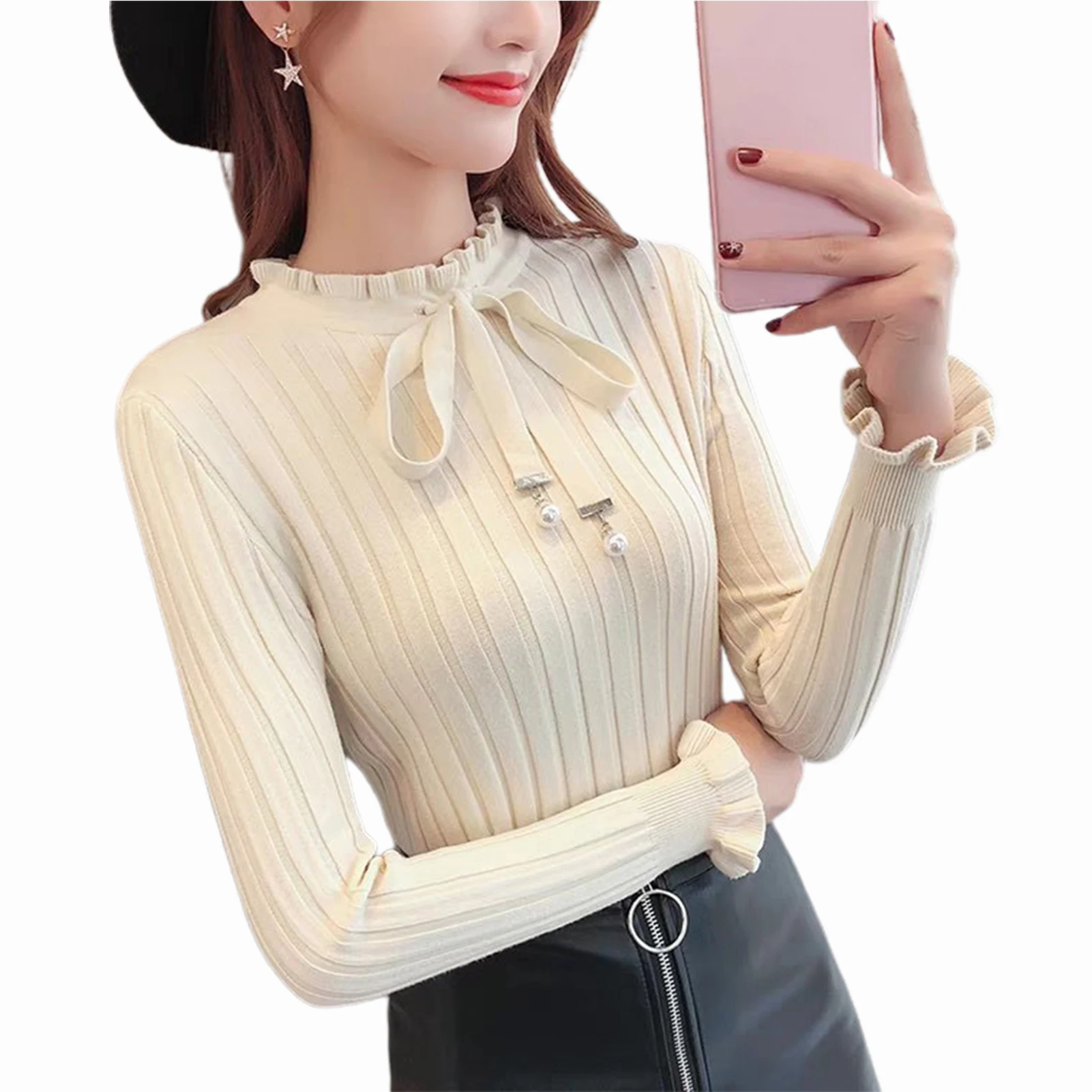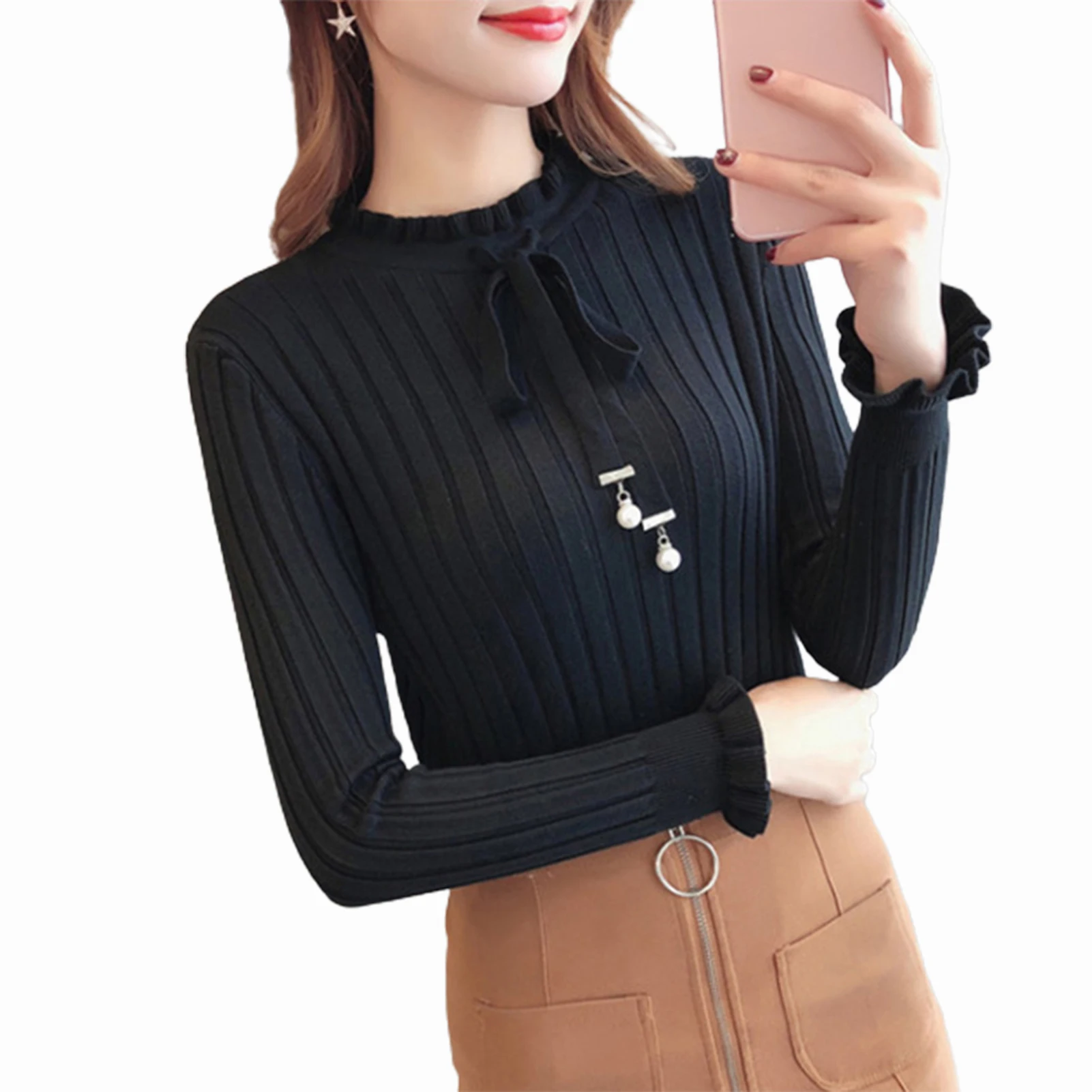 Осенние женские новые стильные футболки с длинным рукавом, бантом Тонкий повседне трикотажные рюшами свитера, пуловеры, топы