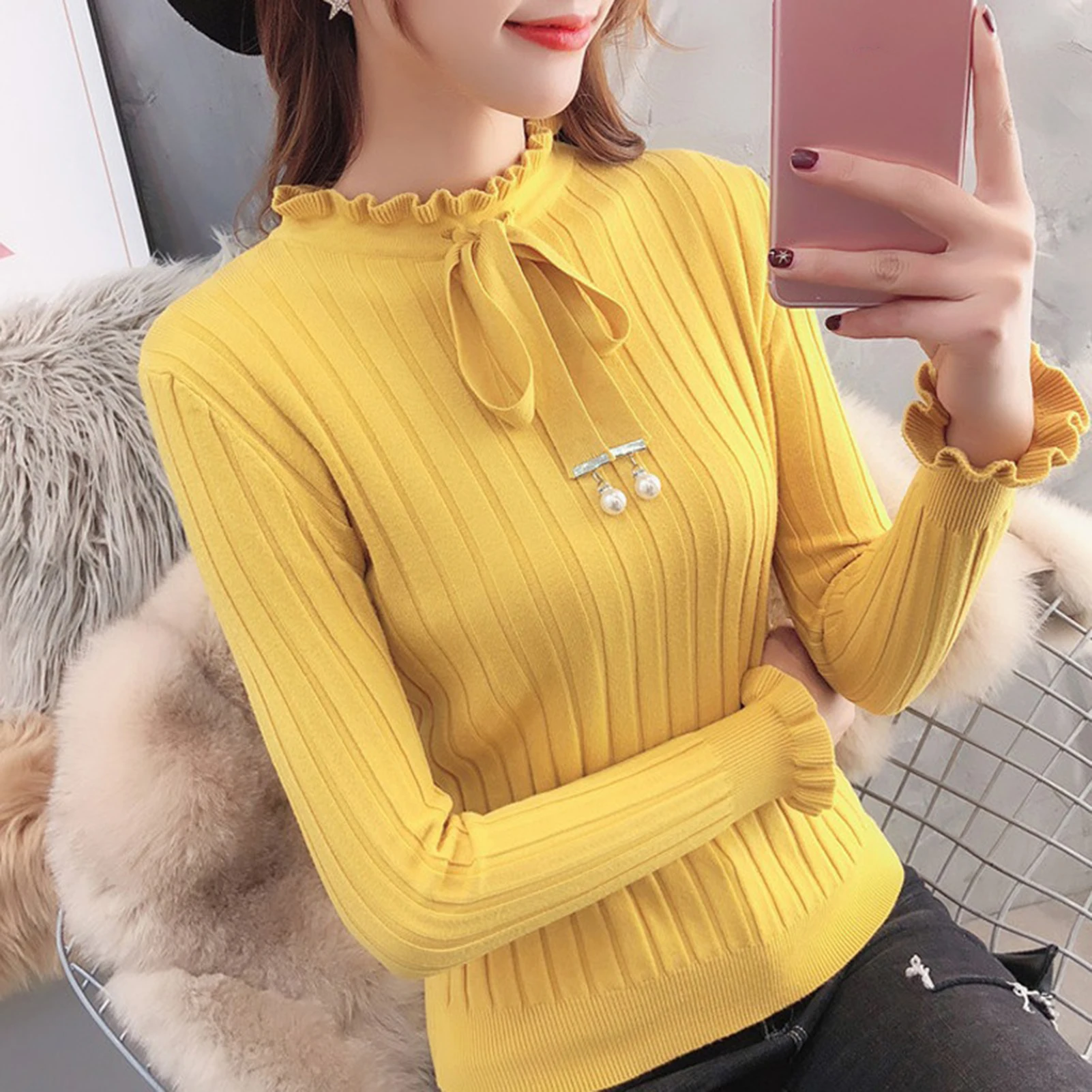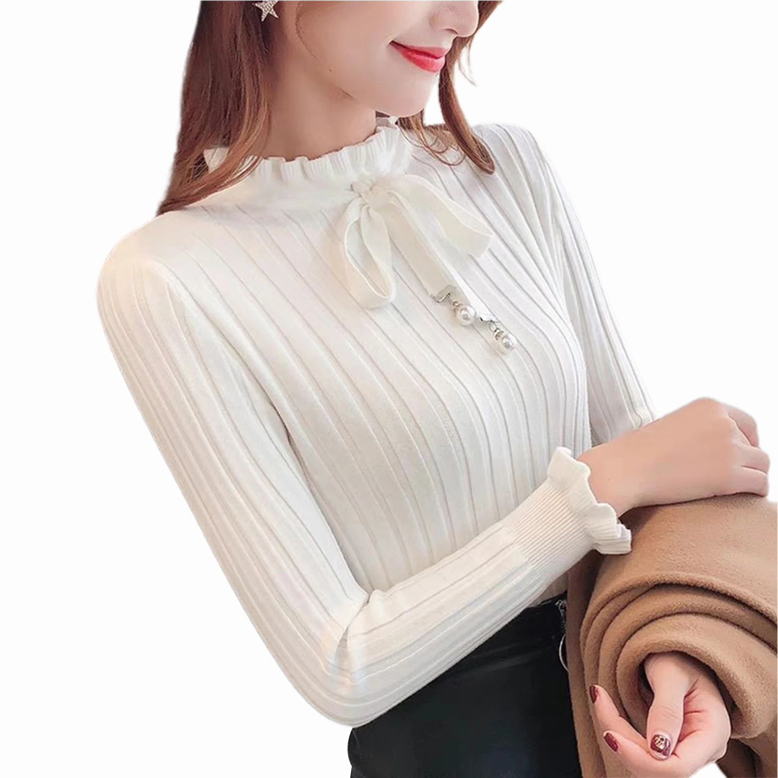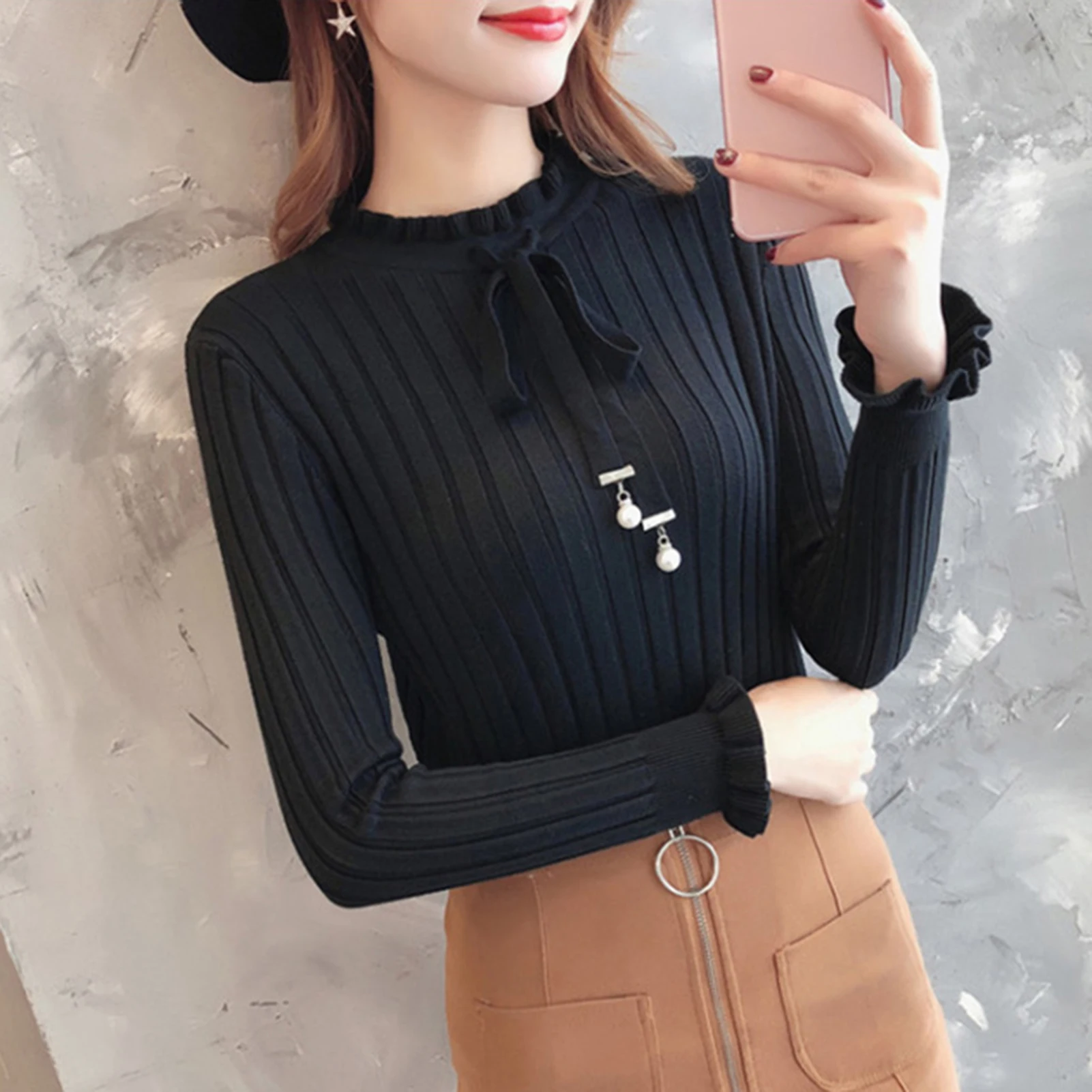 Осенние женские новые стильные футболки с длинным рукавом, бантом Тонкий повседне трикотажные рюшами свитера, пуловеры, топы