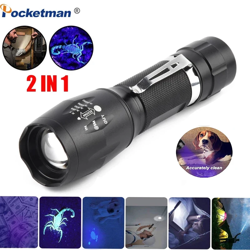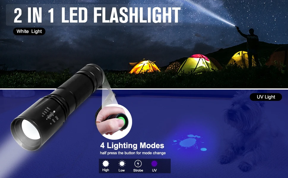 【 2 в 1 светодиодный фонарь с 4 режимами Modes】 4 режима светодиодный POCKETMANФонарик: высокая яркость/Средняя яркость/Стробоскоп/Ультрафиолет. Супер яркий светодиодный фонарь с масштабируемой функцией, создает идеальный сфокусированный прожектор с более длинным радиусом облучения (до 350 метров); Или Блестящий большой прожектор для более широкого обзора. Идеально подходит для улицы, ночного клуба, пешего туризма, рыбалки, велоспорта, альпинизма, кемпинга и барбекю