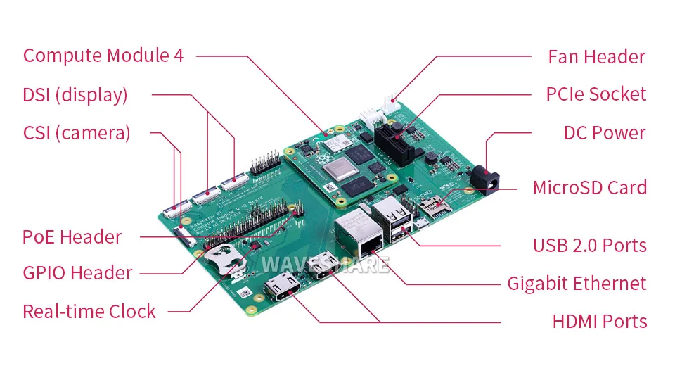 ВВычислительный модуль 4 IO ПлатаЭто плата-компаньон для Raspberry Pi Compute Module 4 (поставляется отдельно). Он предназначен для использования как в качестве системы разработки для вычислительного модуля 4, так и в качестве встроенной платы, интегрированной в конечные продукты.