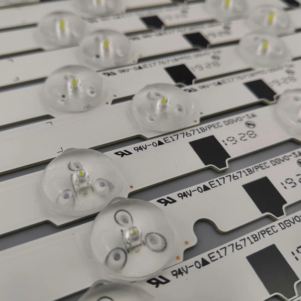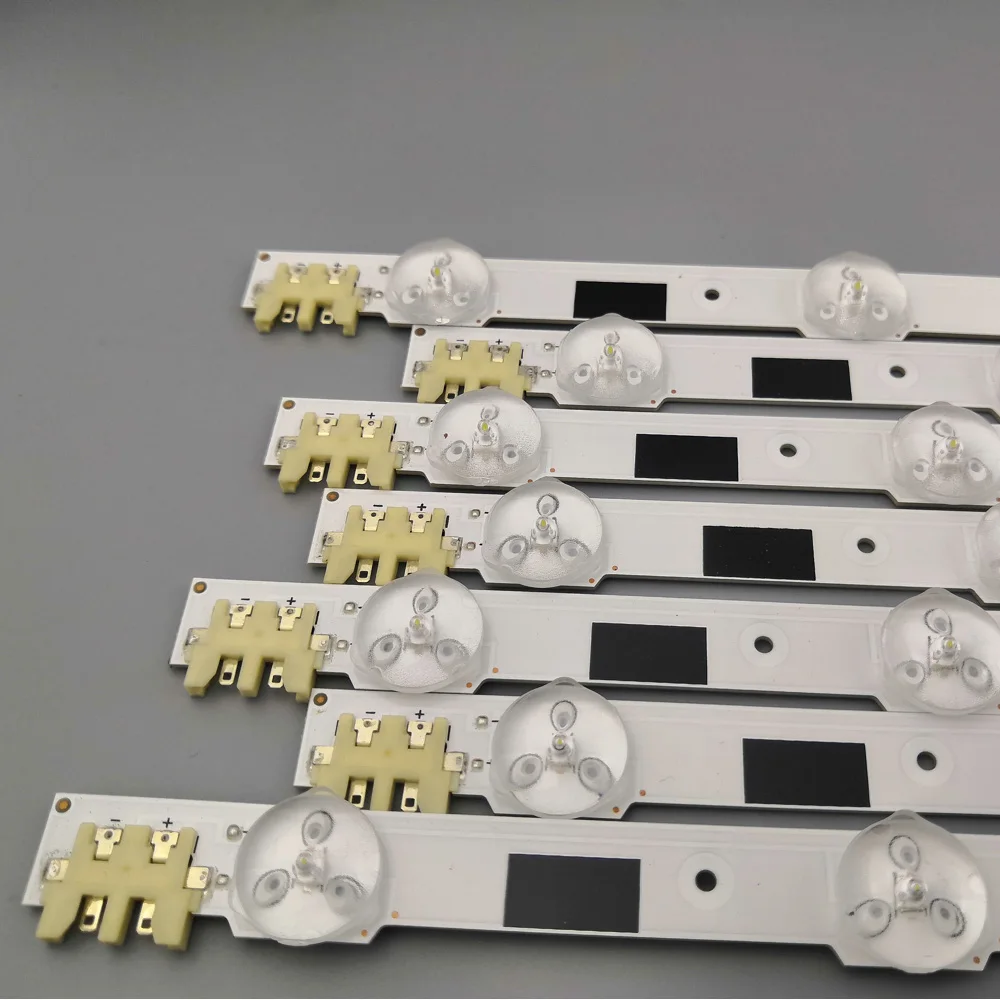 Полоски фиксируются по длине, их нельзя обрезать. Размер: 802 мм Кол-во светодиодов: 13 светодиодов (8 + 5) Напряжение: 39 в (24-15) Световая цепь: 13 серий 0 параллельная Напряжение одной лампы: 3 в 1 шт = 2 шт (1 шт 500 мм 8 светодиодов + 1 шт 322 мм 5 светодиодов) Посылка: 7 комплектов (14 шт.)